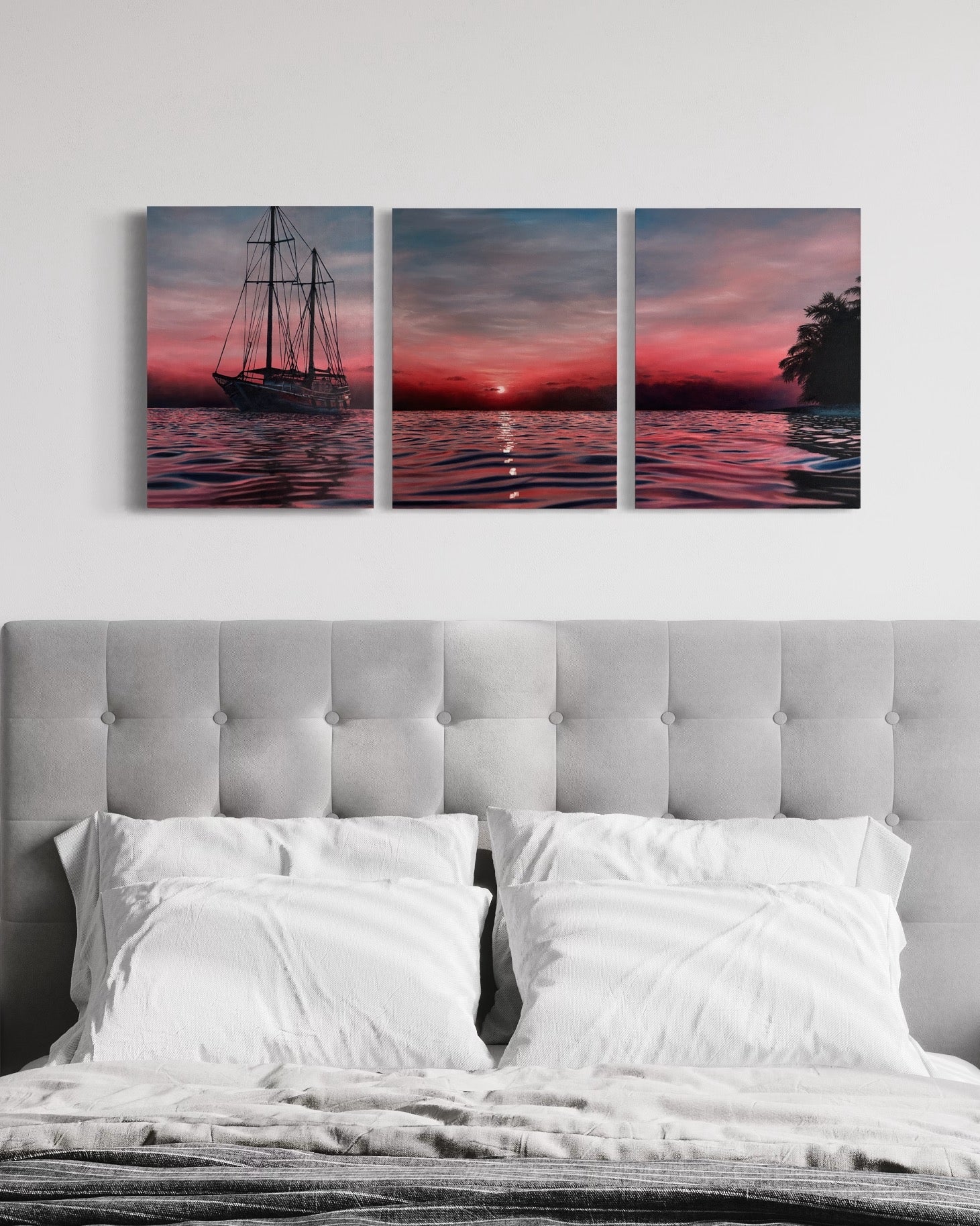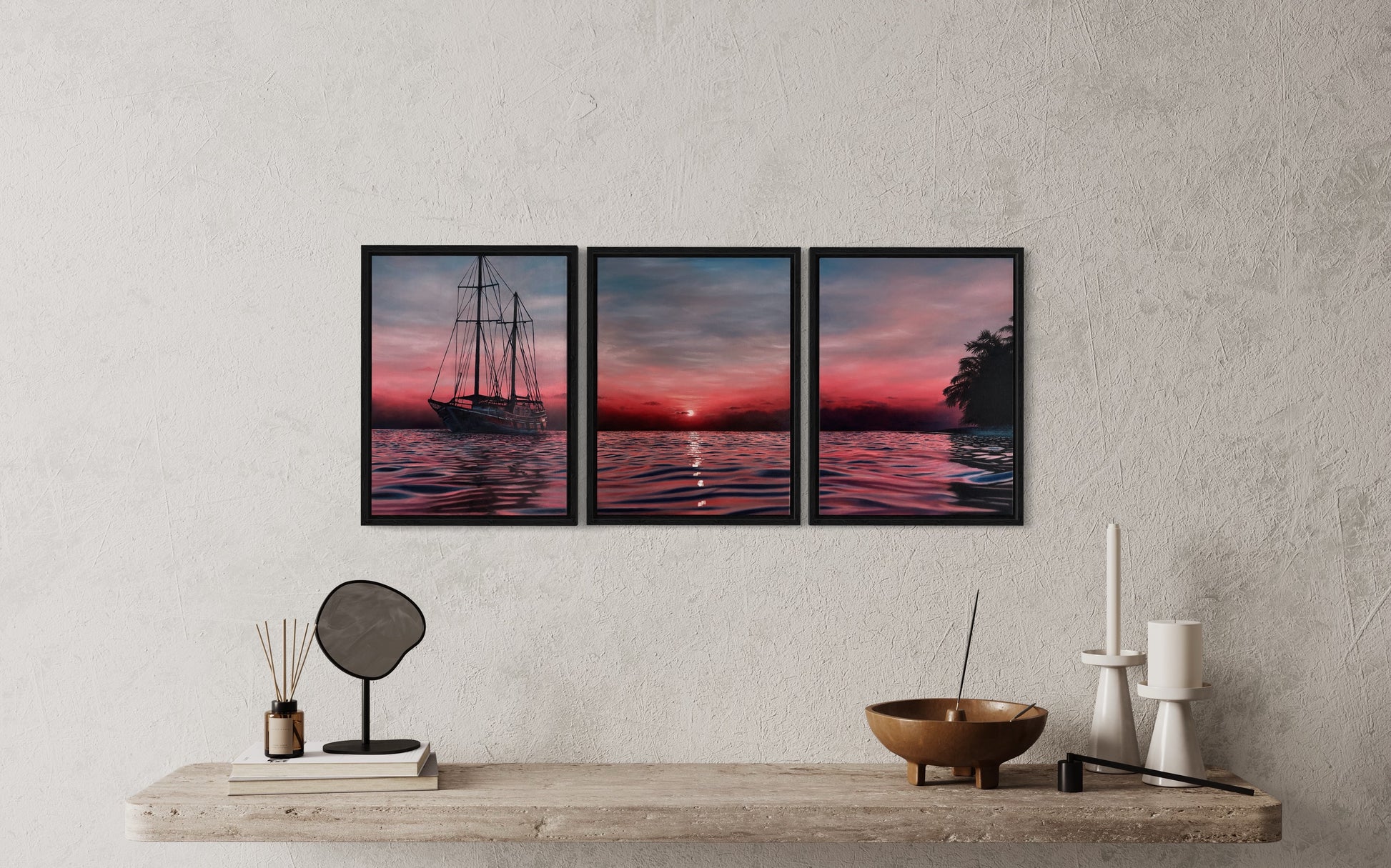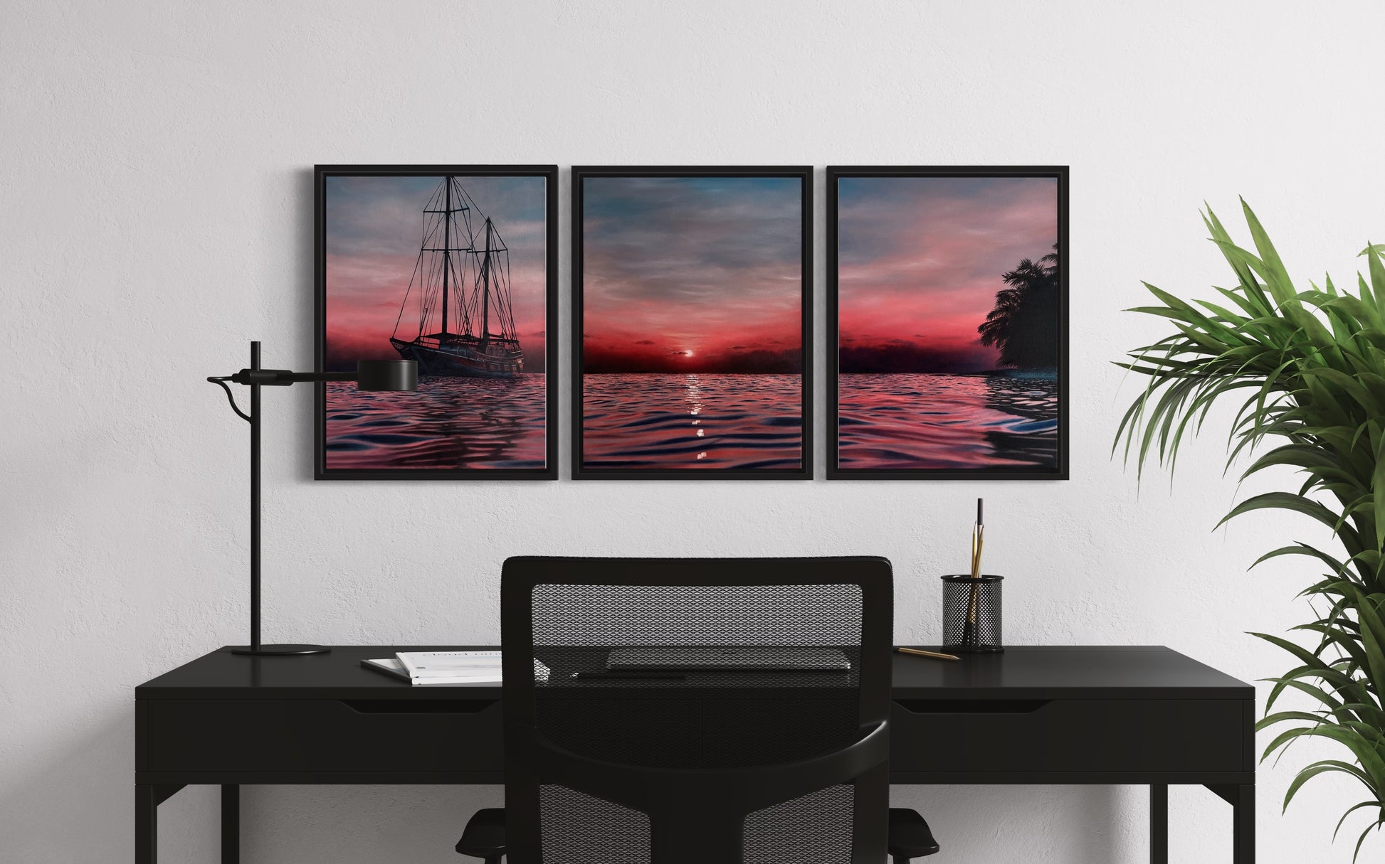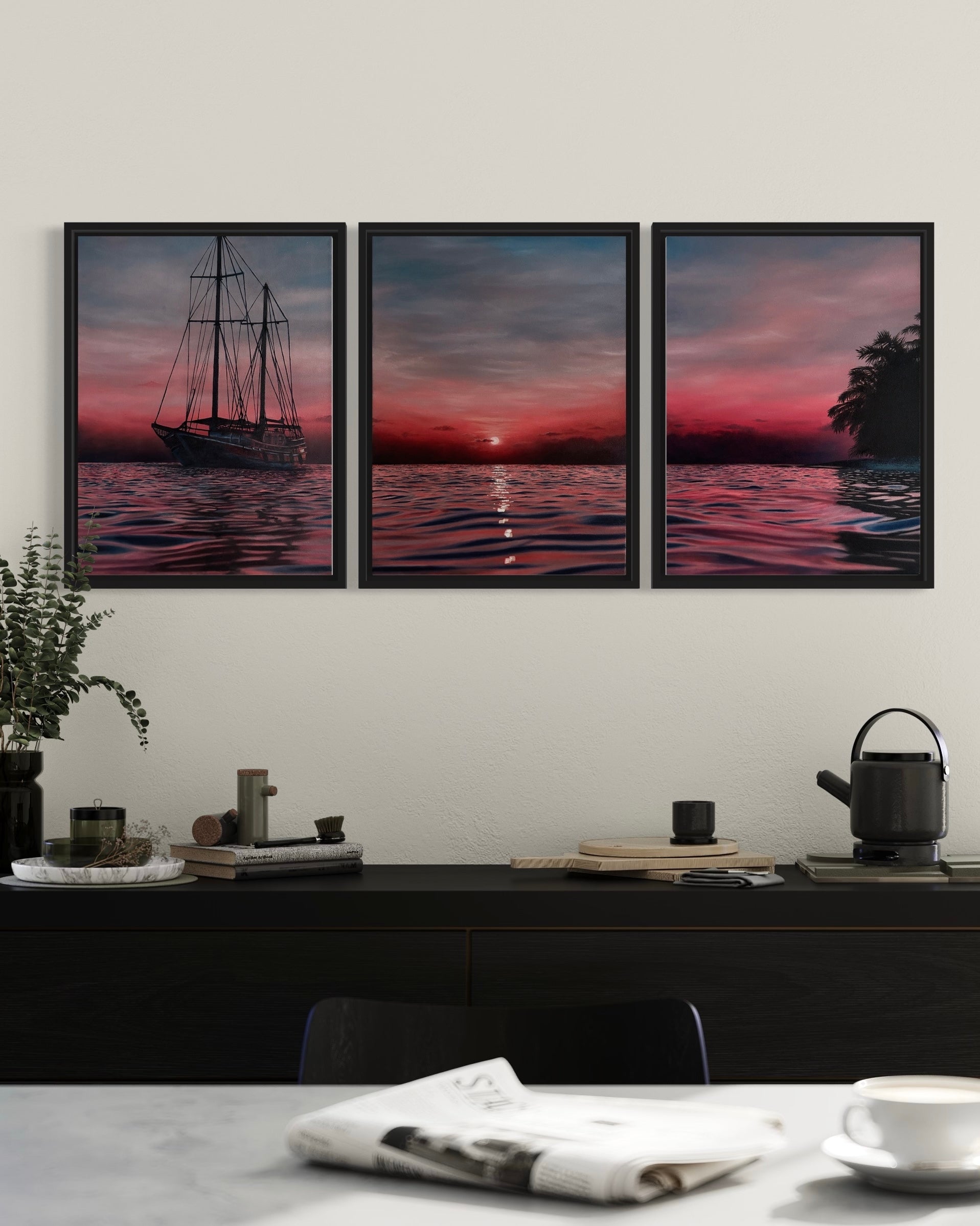 This painting depicts a red, orange and pink sunset over the ocean. A sailing ship coasts through the waters on one side with the silhouette of palms on the other. The sun peeks above the horizon casting glimmering reflections in the waves.