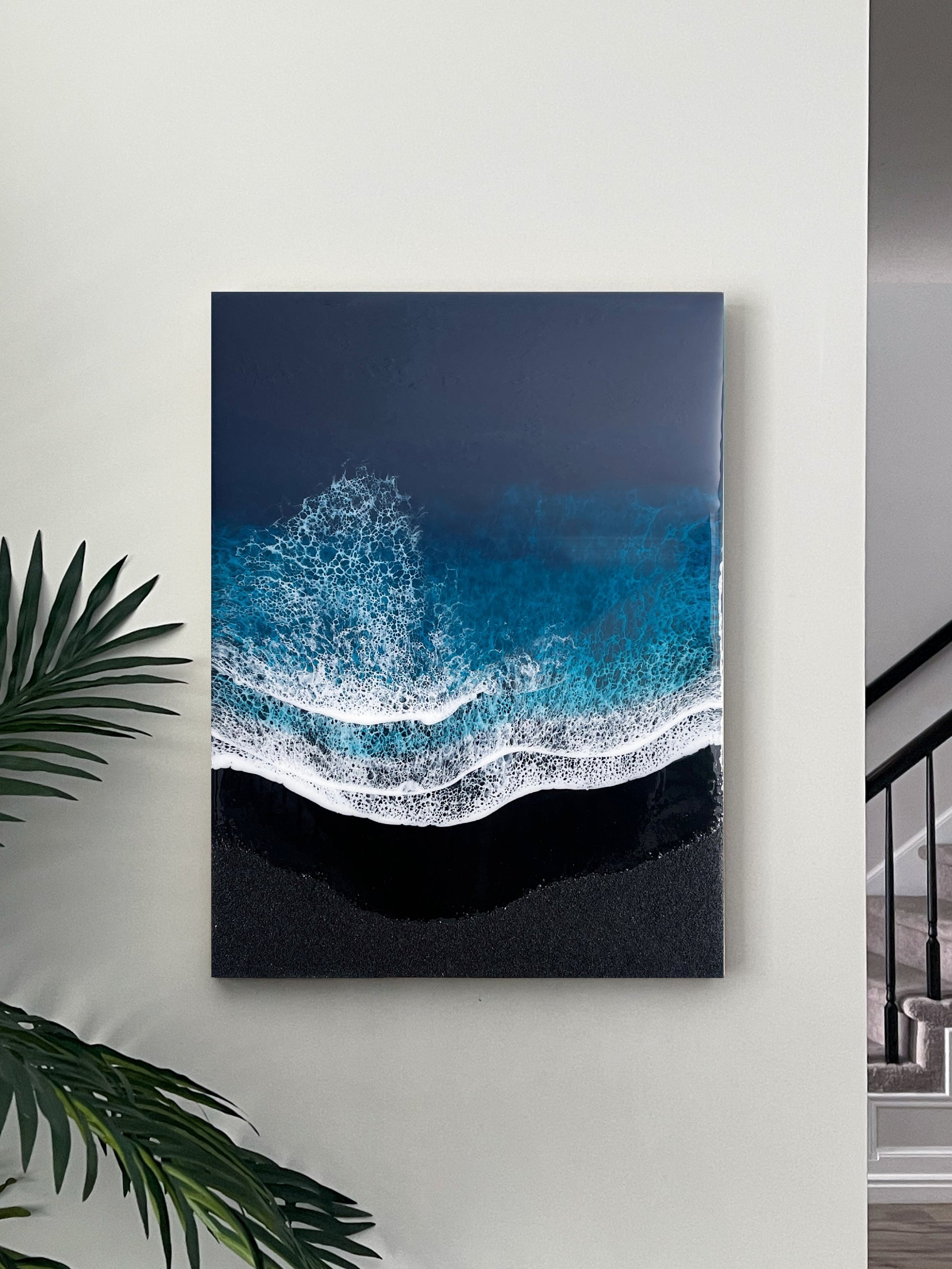 This stunning 18” x 24” x 2” resin art piece captures the power and mystery of the ocean in a modern and sleek design. The piece is crafted on a cradled wood panel and features real black sand, adding an authentic touch to the artwork.