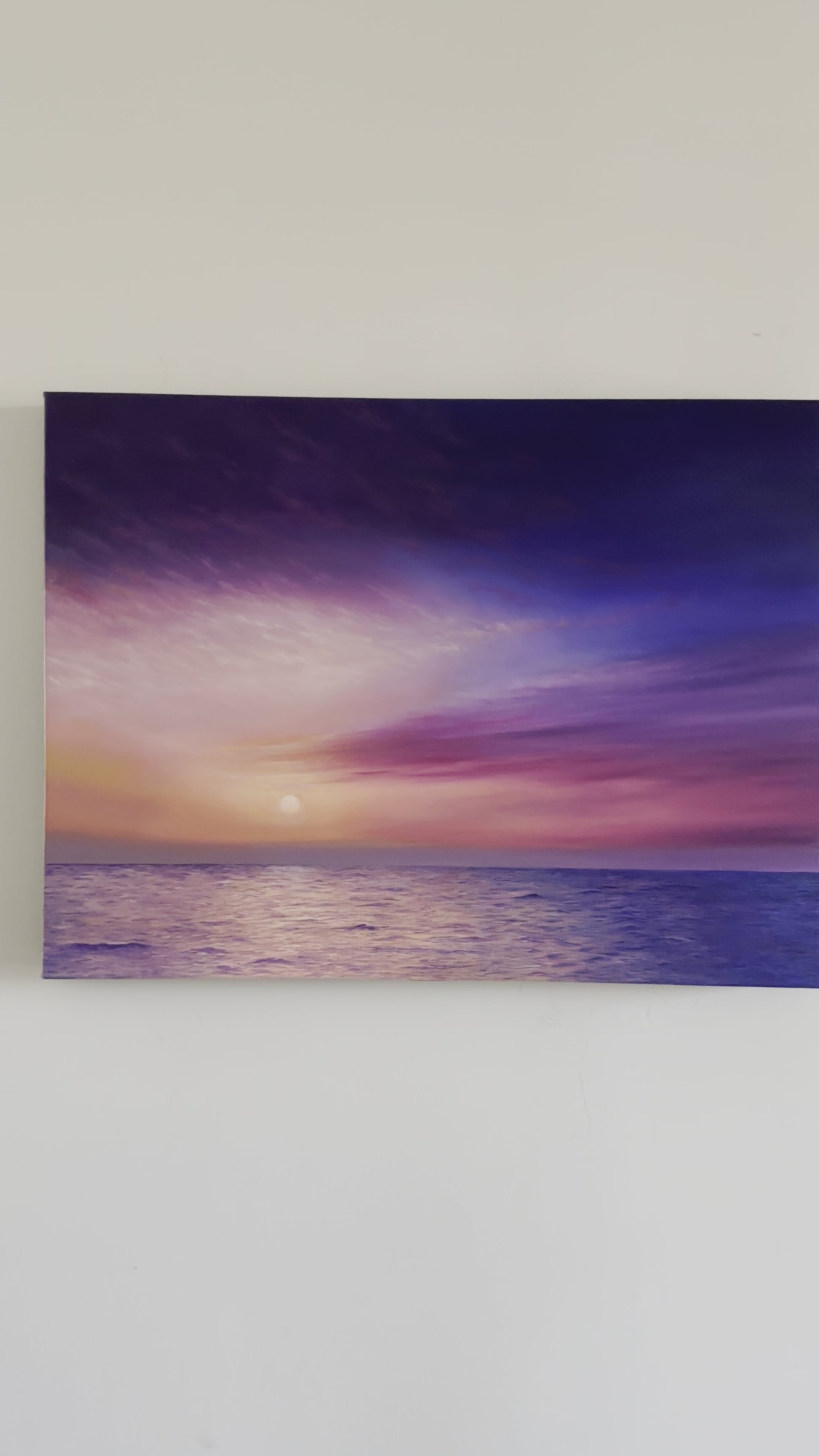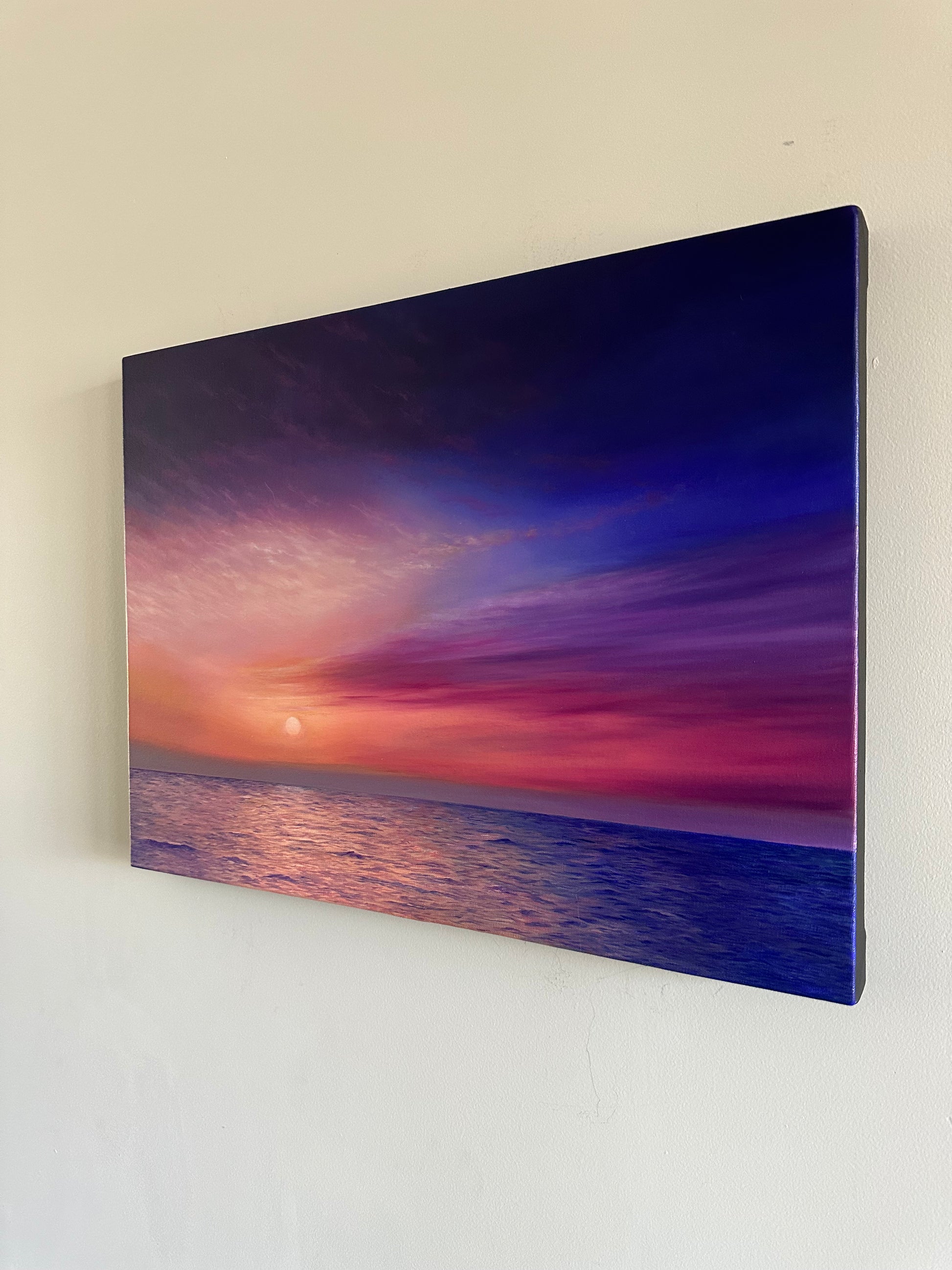 Behold the captivating allure of "Embraced," an enchanting 18”x24” oil painting on canvas. Immerse yourself in the resplendent hues of a bright and radiant sunset, casting its warm glow over the vast ocean. The shimmering waters mirror the glorious colors of the sky, creating an ocean filled with mesmerizing tones. Let the ethereal beauty of this artwork transport you to a world of tranquility and wonder, where the interplay of light and water paints a breathtaking canvas of serenity. "Embraced" captures the essence of a moment in nature's grand symphony, inviting you to revel in its harmonious and vivid splendor.