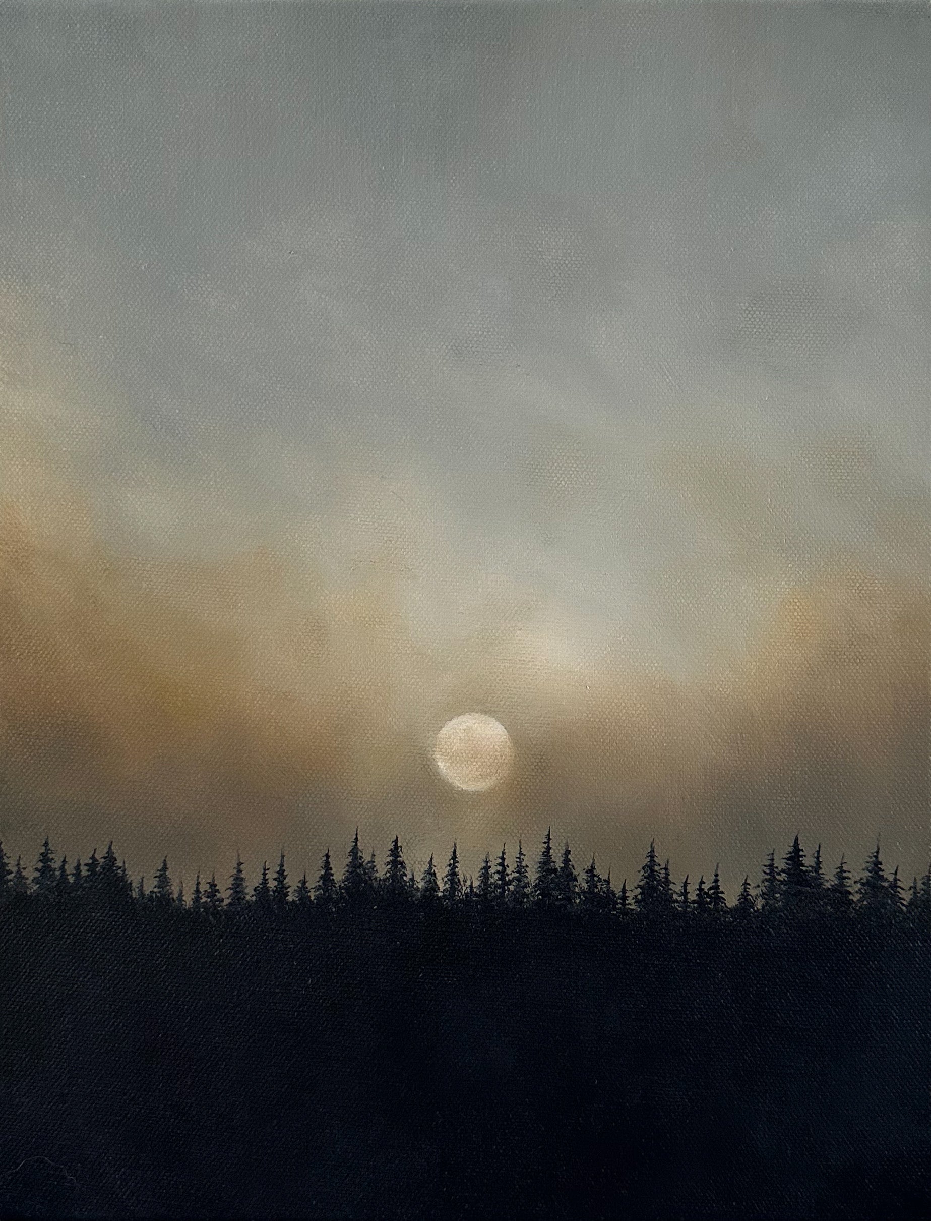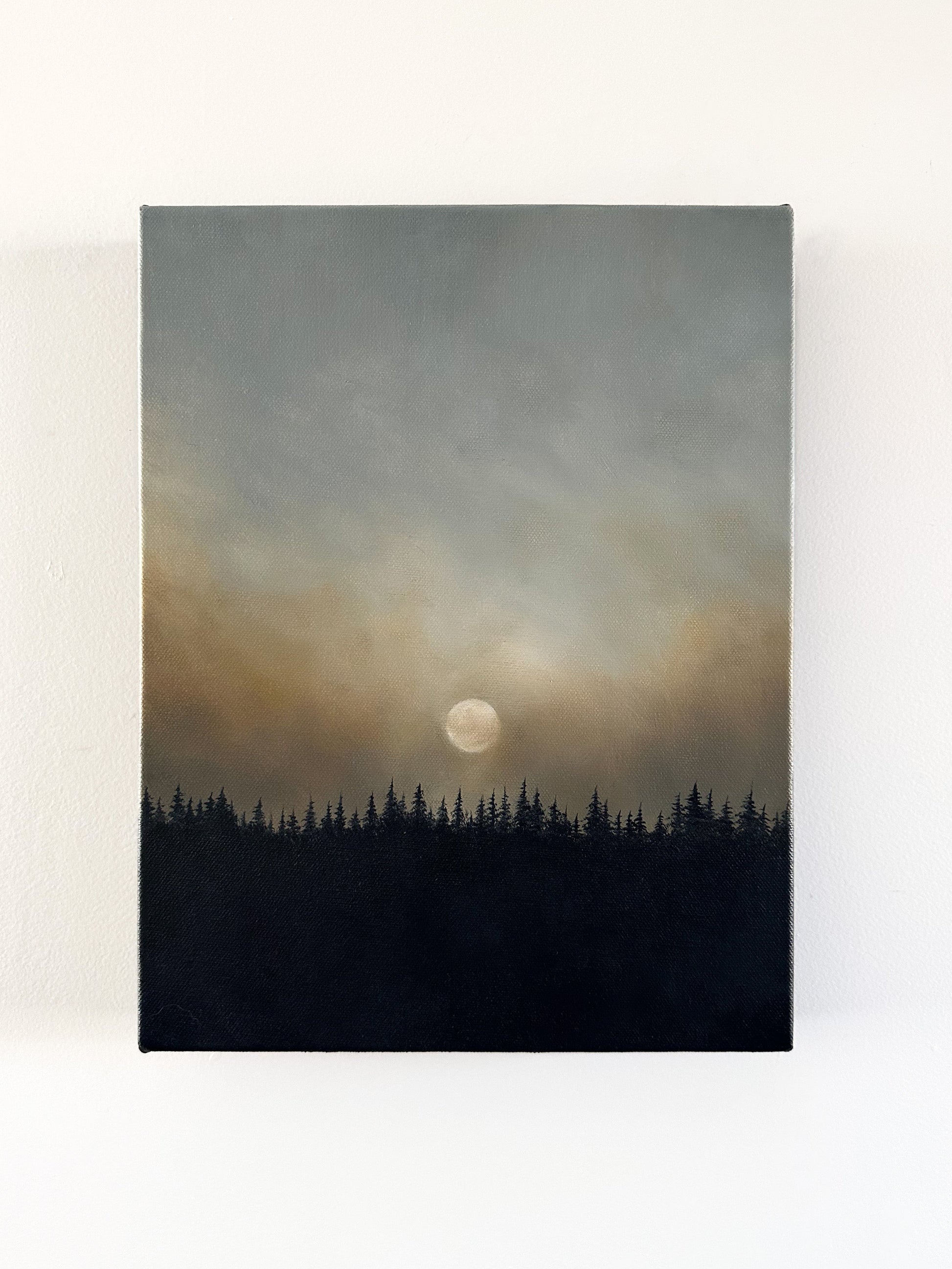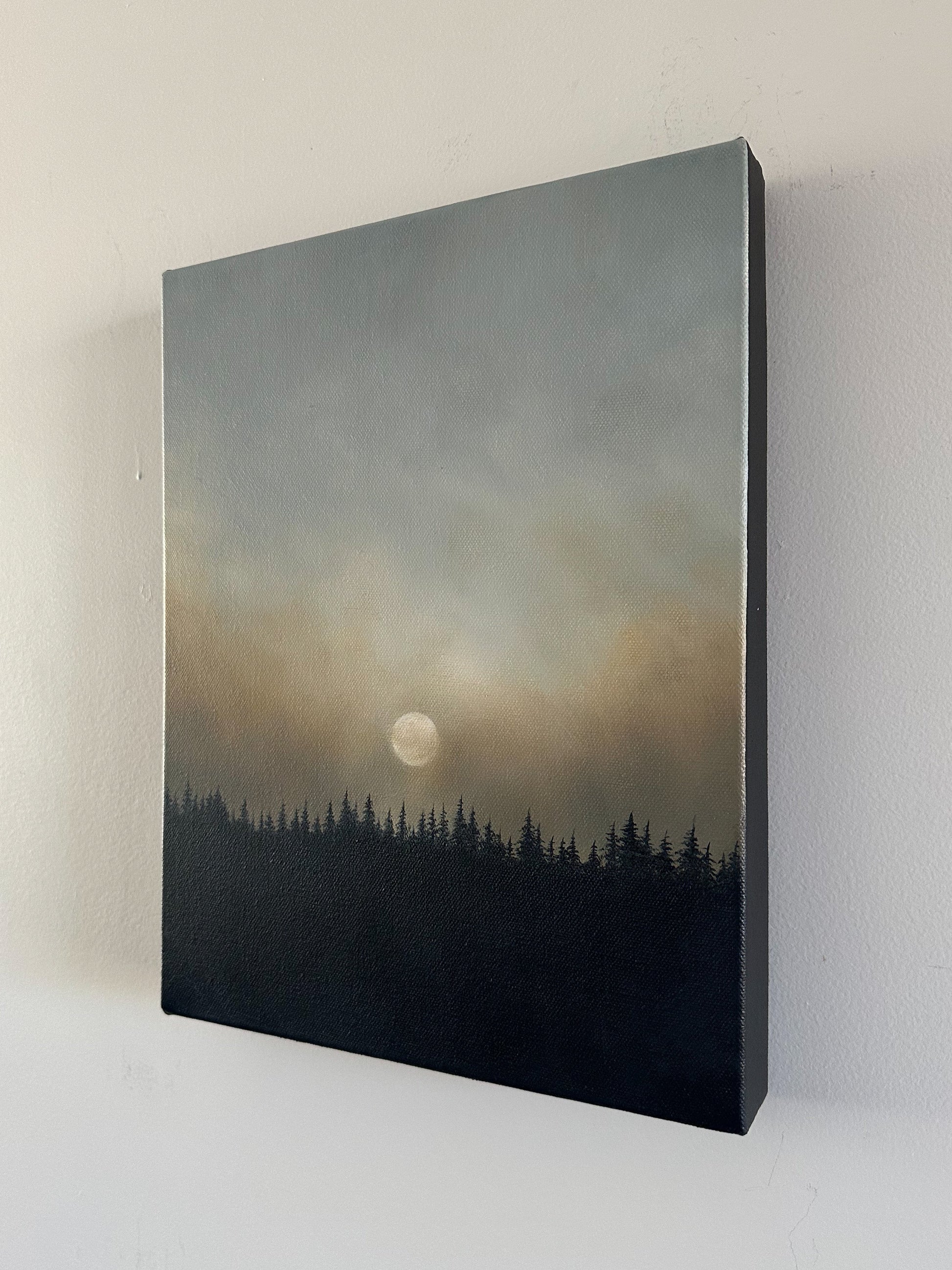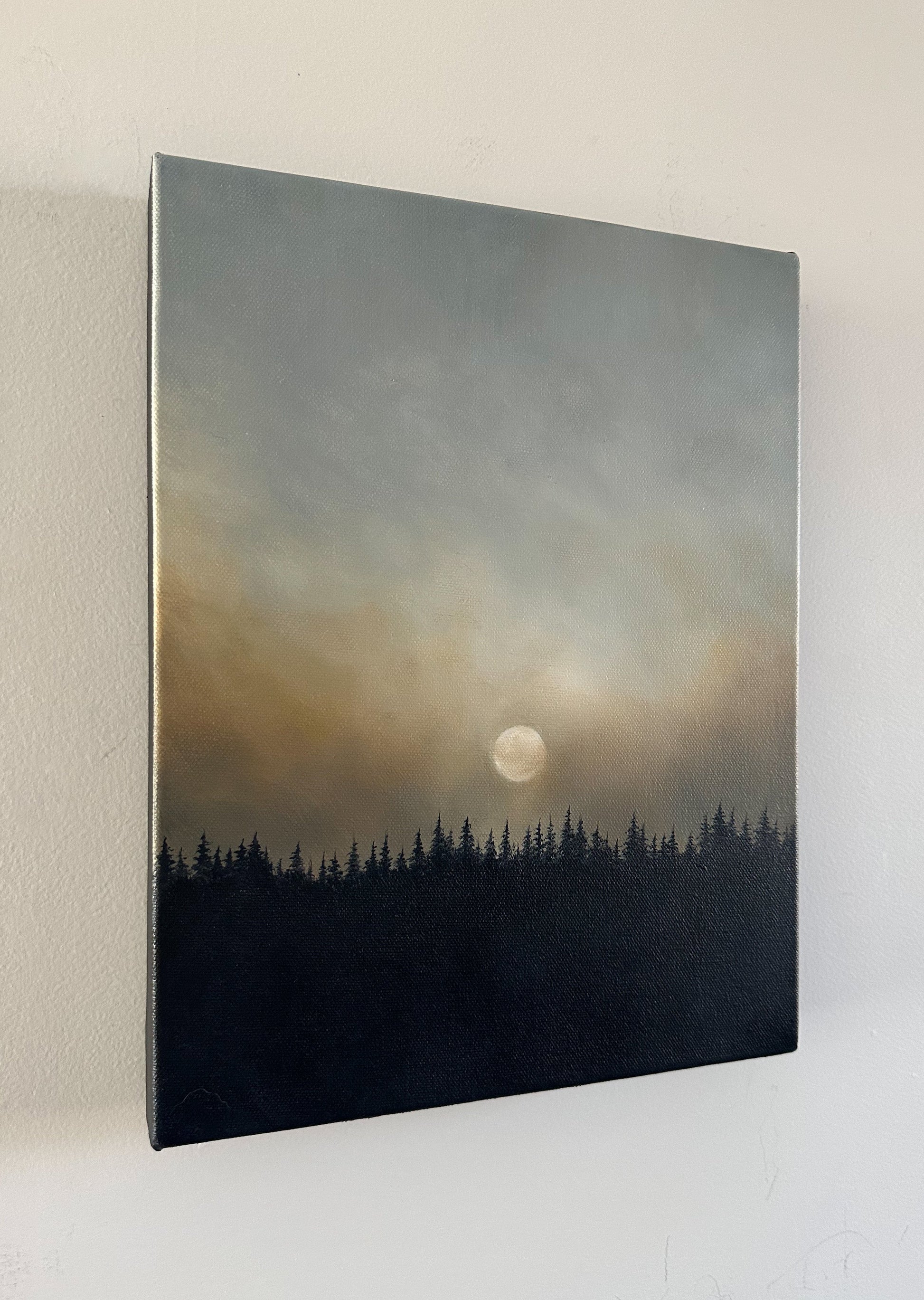 Welcome the mesmerizing charm of "Embracing Stillness," an 11”x14” oil painting on cradled canvas. The canvas showcases a stunning burnt orange skyline blending into a serene grey sky, with a majestic black forest in the foreground. Gaze upon the canvas, and you'll notice the subtle presence of a radiant moon above the tranquil forest, casting a soft glow upon the landscape. Immerse yourself in the calming beauty of this artwork and let it add a touch of enchantment to your space.