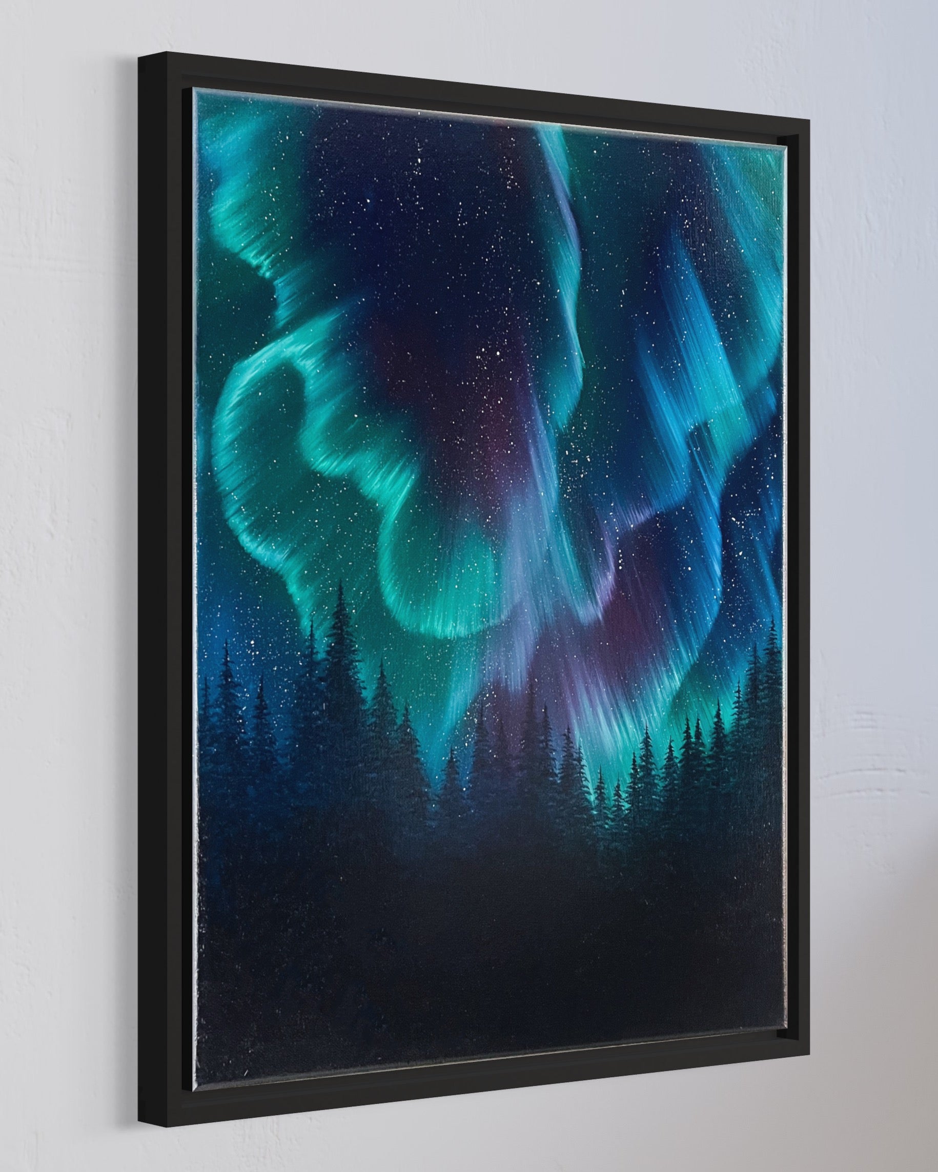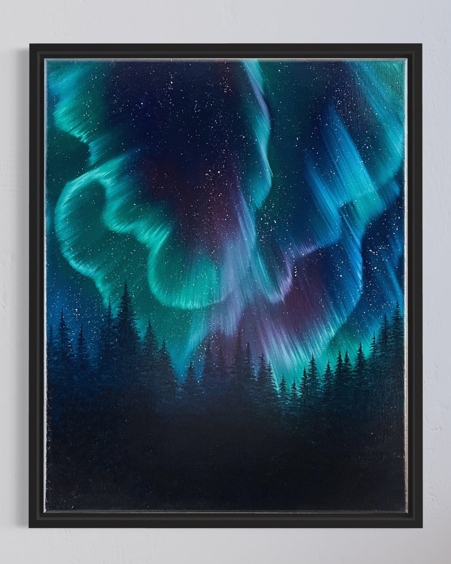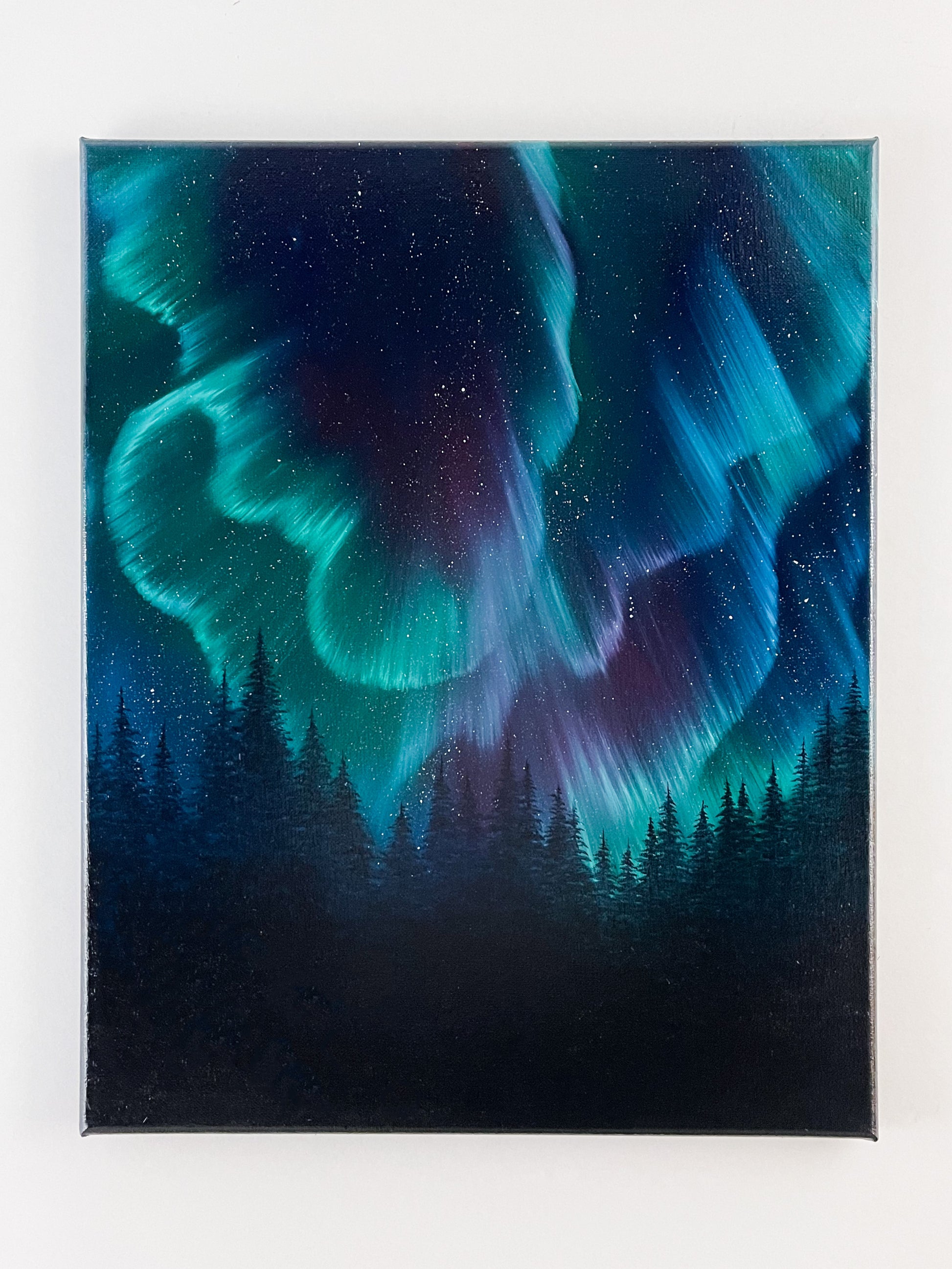 Beautiful northern lights oil painting on canvas.
