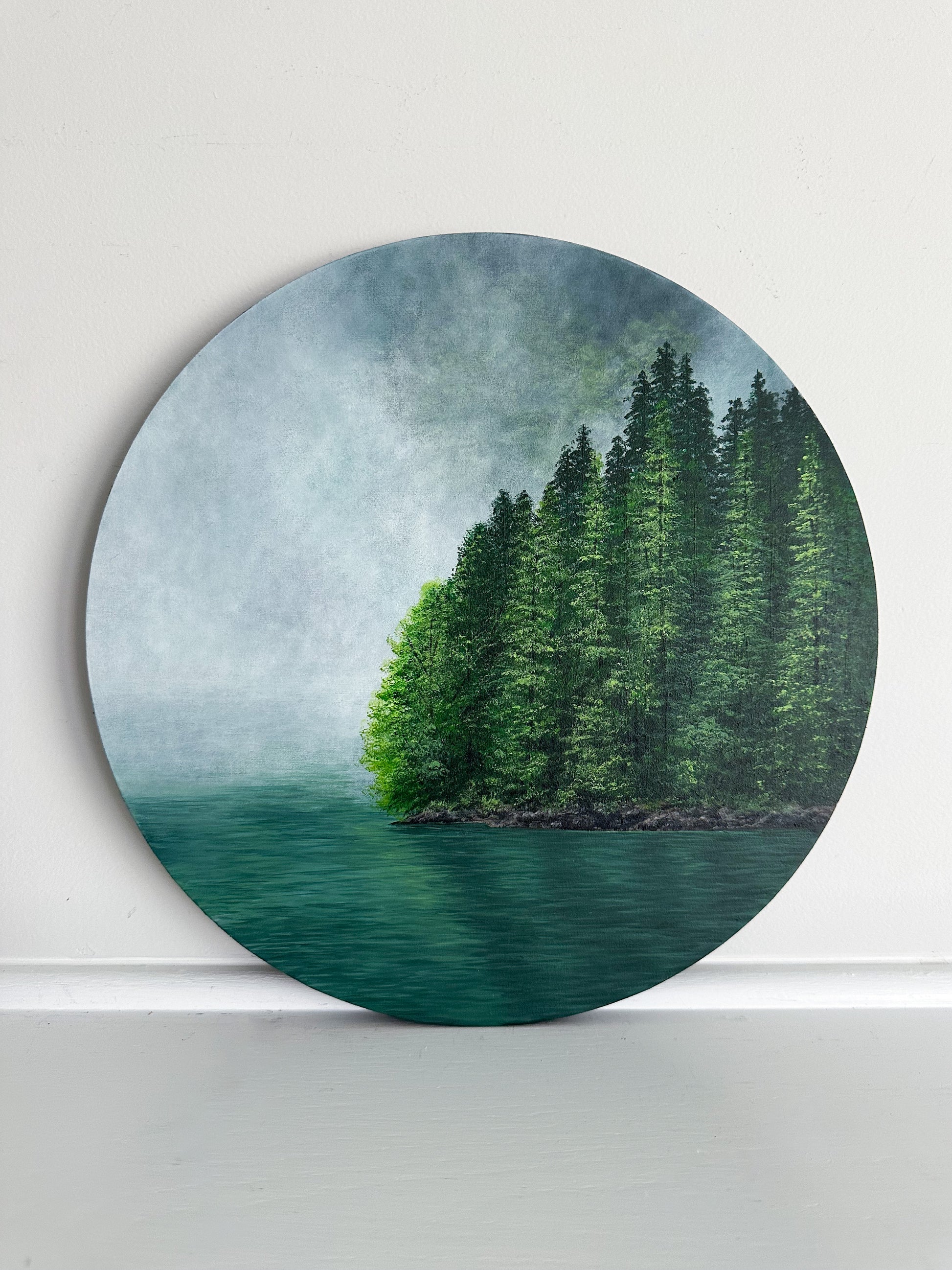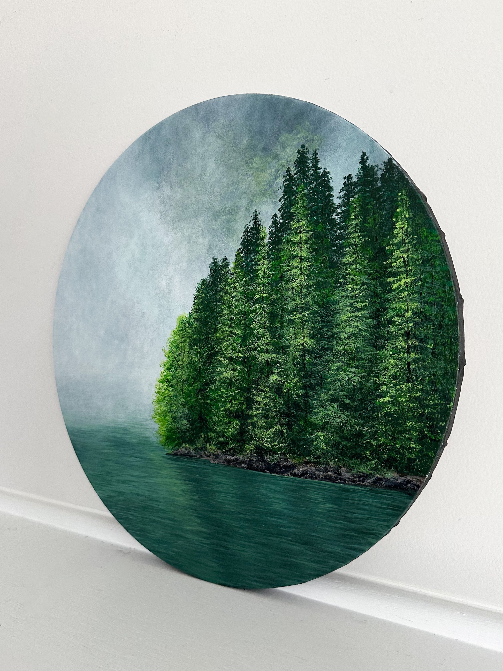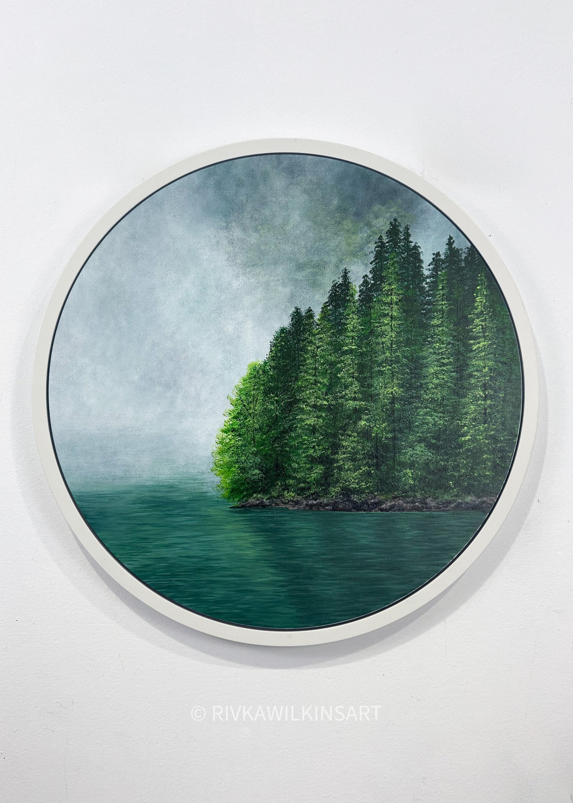 Embark on a journey of enchantment with my acrylic painting, "Isle of Whispers." This captivating artwork, delicately crafted on a 14" canvas wrapped wood panel, transports you to a misty forest where a hidden gem awaits—a picturesque island adorned with light green trees, emerging from the depths of a murky green-blue lake.