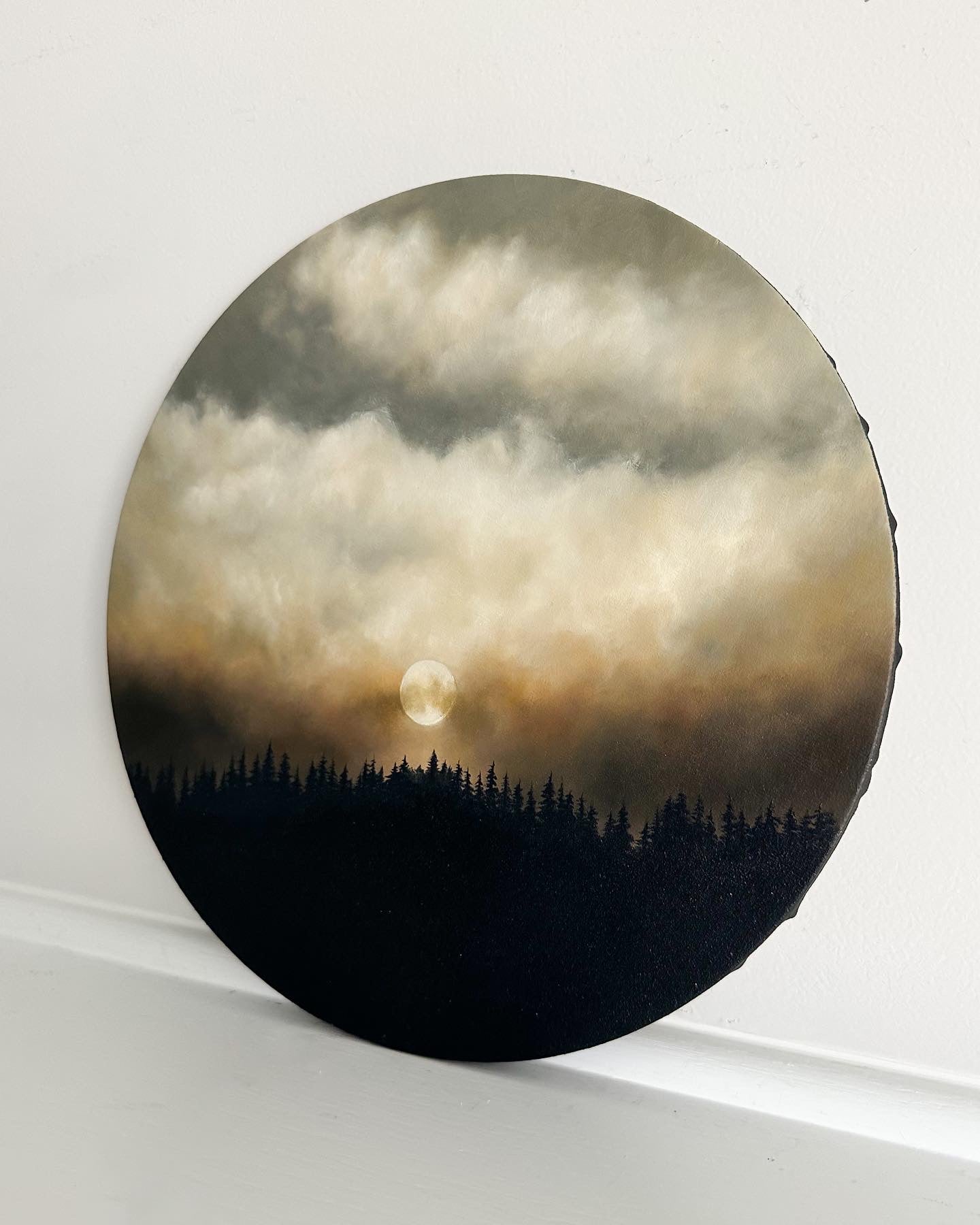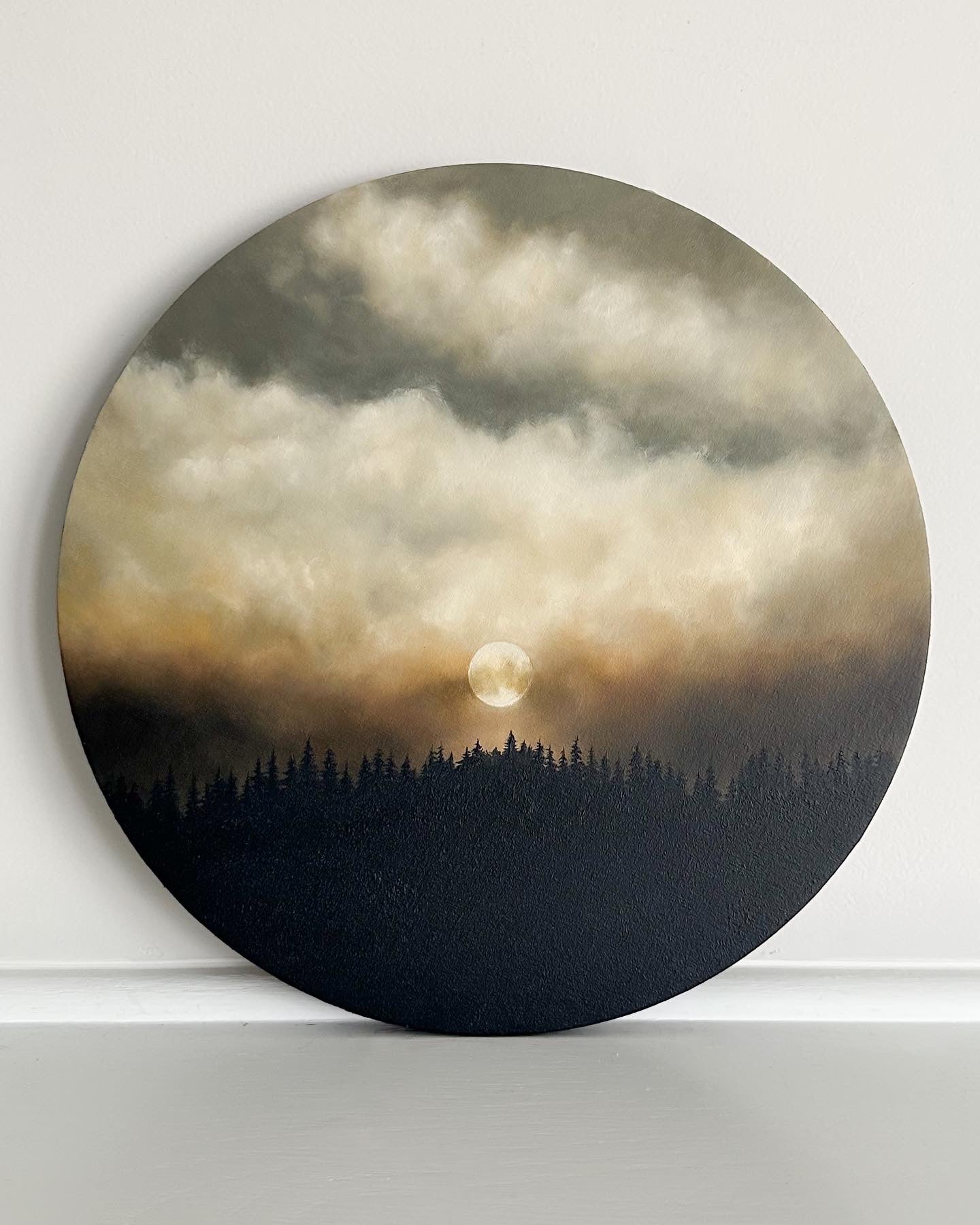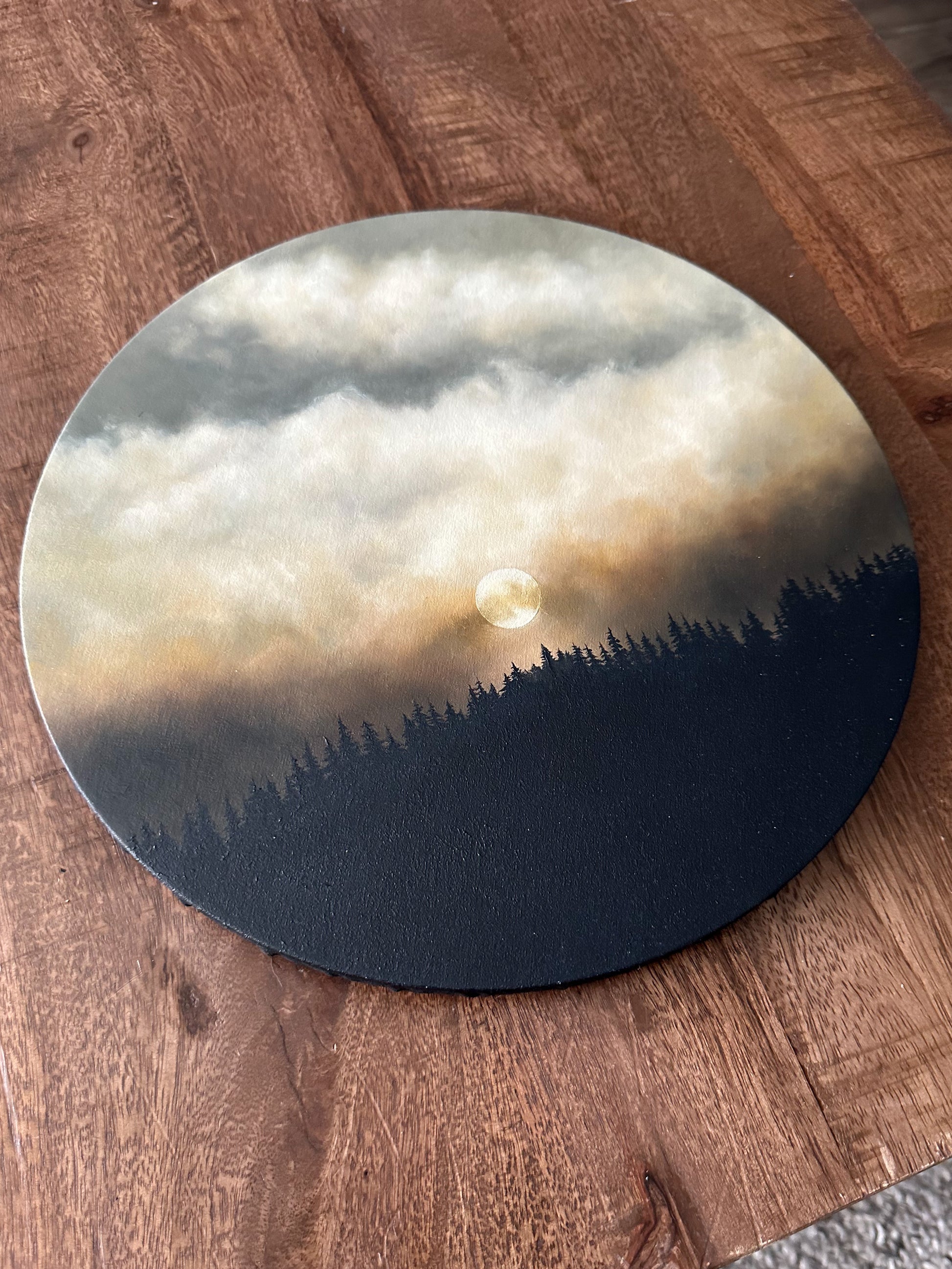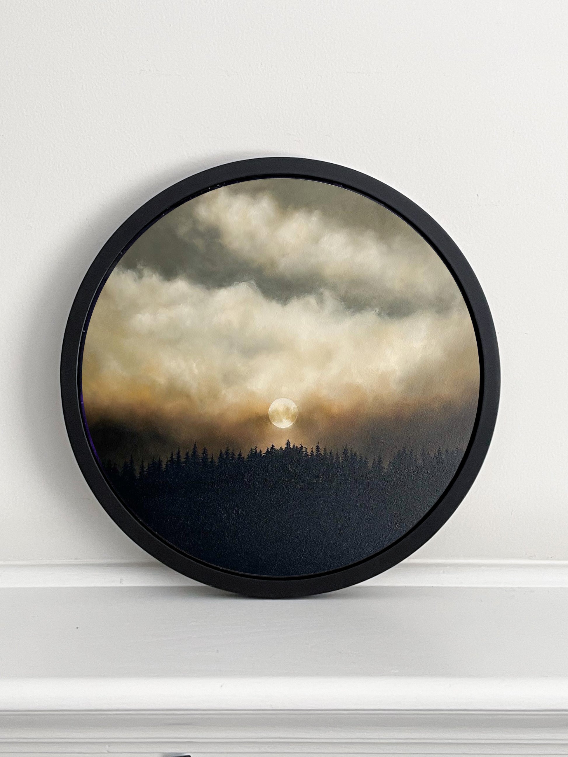This evocative artwork, masterfully crafted on a 12" canvas wrapped wood panel, immerses you in a scene where a bright moon takes center stage amidst a dramatic sky of white, cream, and dark orange clouds, contrasting against a hauntingly beautiful black forest foreground.