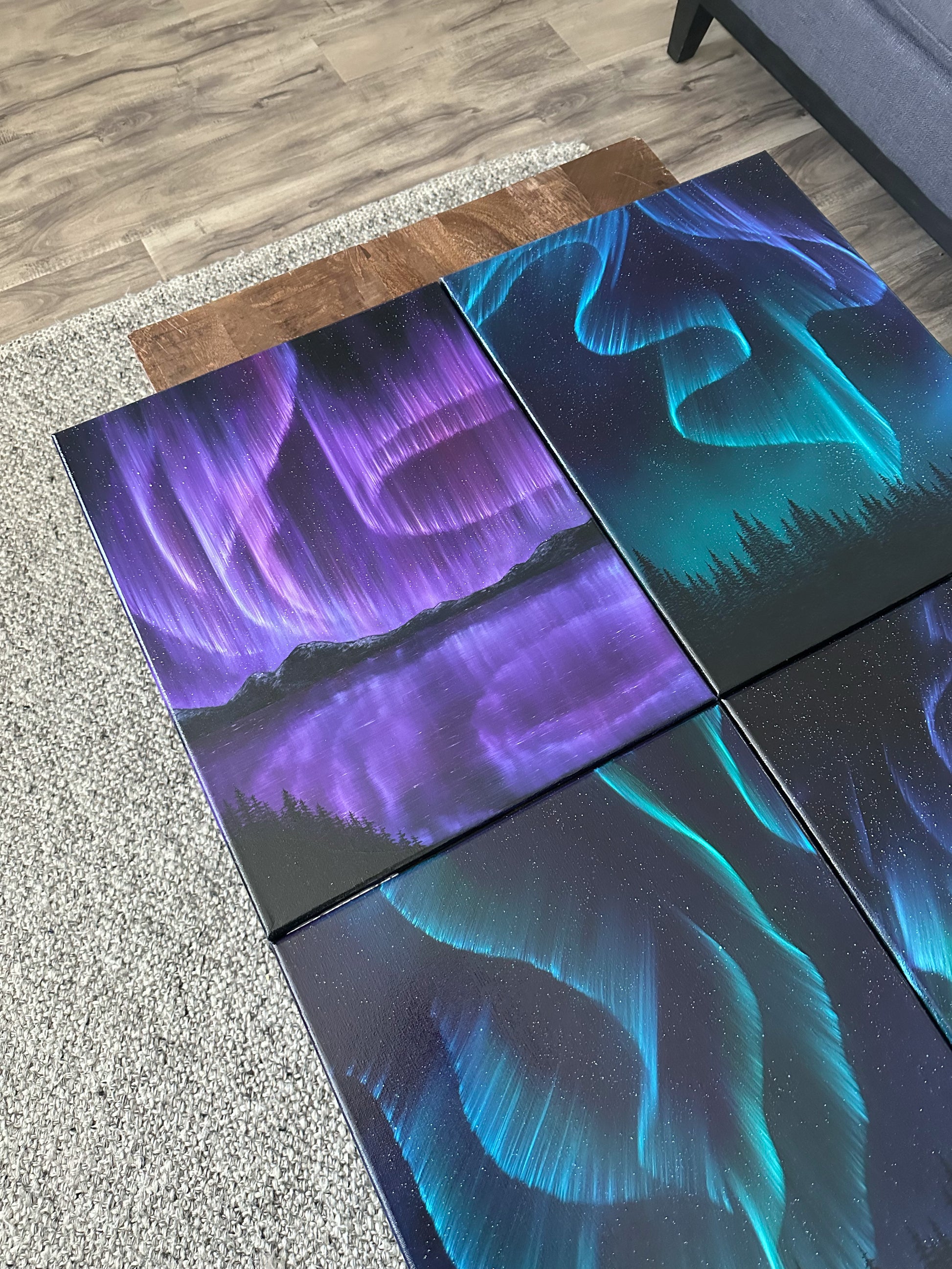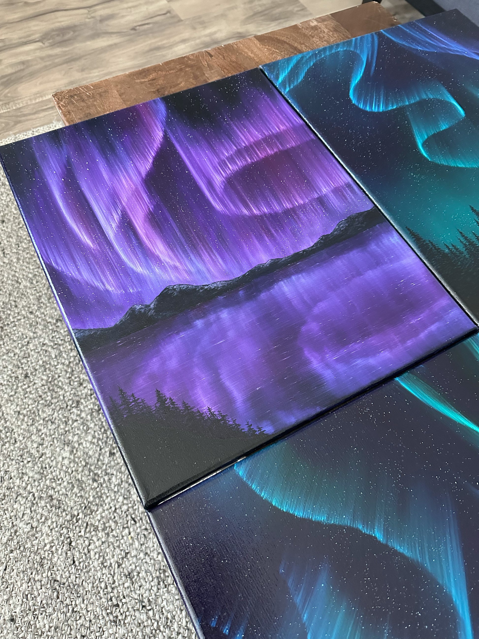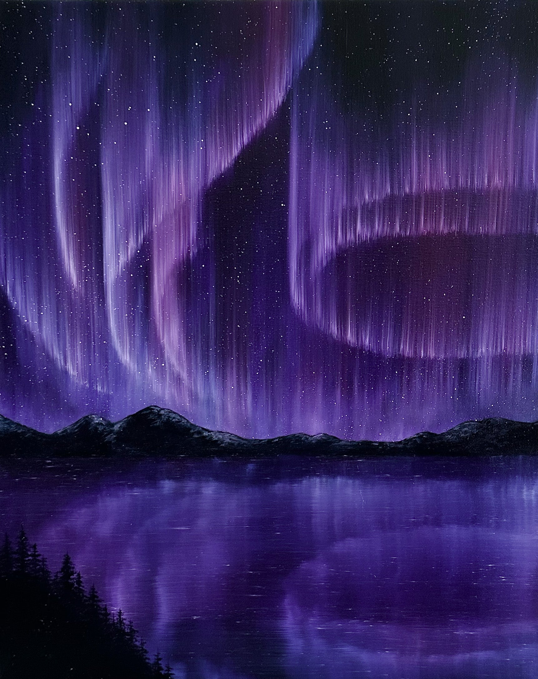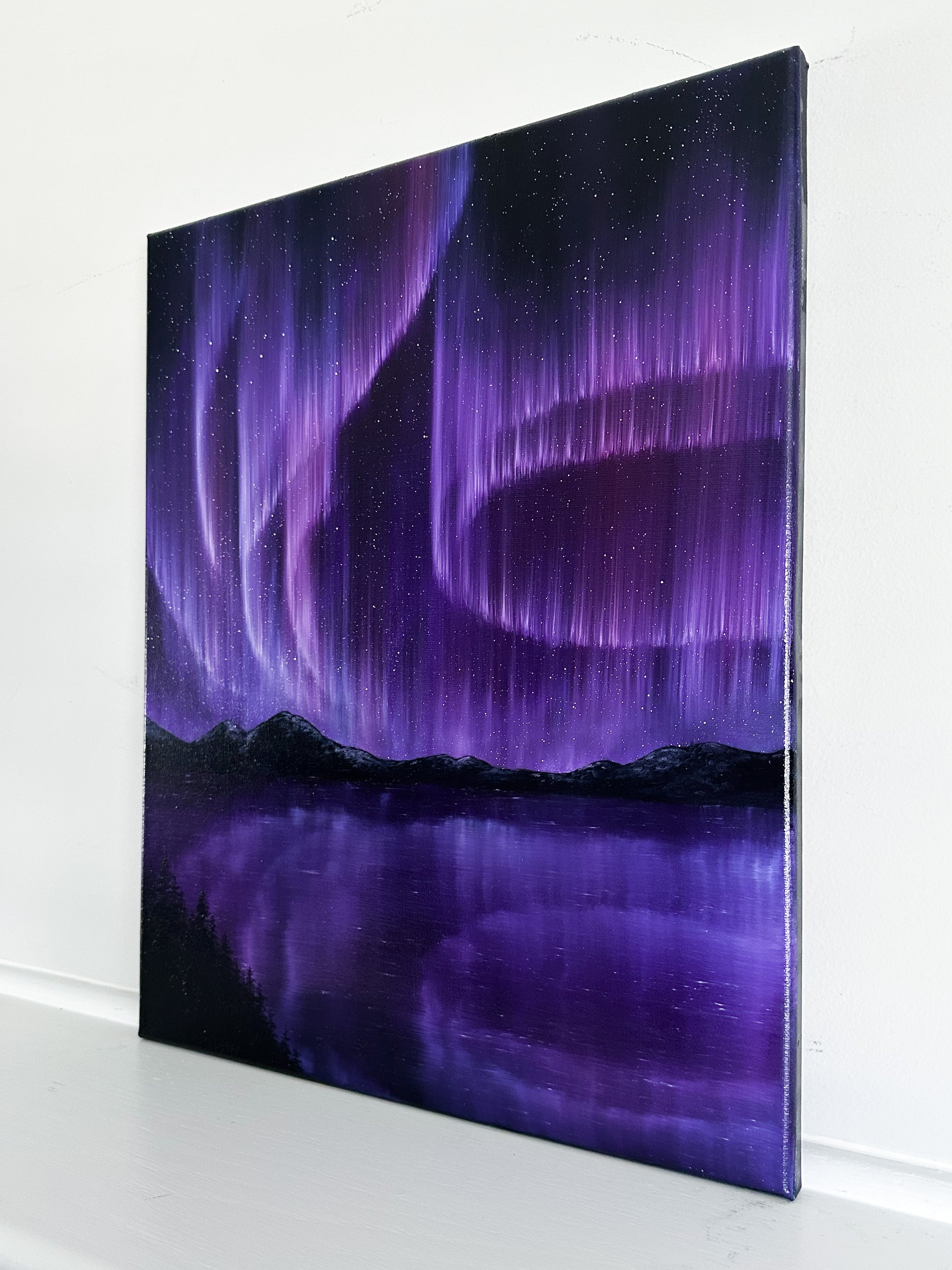 I am excited to share with you my latest 16" x 20" oil canvas painting that captures the mesmerizing beauty of the Northern Lights. The sky is filled with shades of purples and pinks, a stunning contrast against the dark night sky. In the center of the painting, you'll find majestic mountains and a serene lake, beautifully reflecting the colors of the aurora. This painting transports you to a place of peace and tranquility, where the beauty of nature is all around you. As you gaze upon it, you can almost feel the cool night air on your skin and hear the gentle rustle of the leaves in the forest. I hope this painting brings you as much joy and peace as it brought me while creating it.
