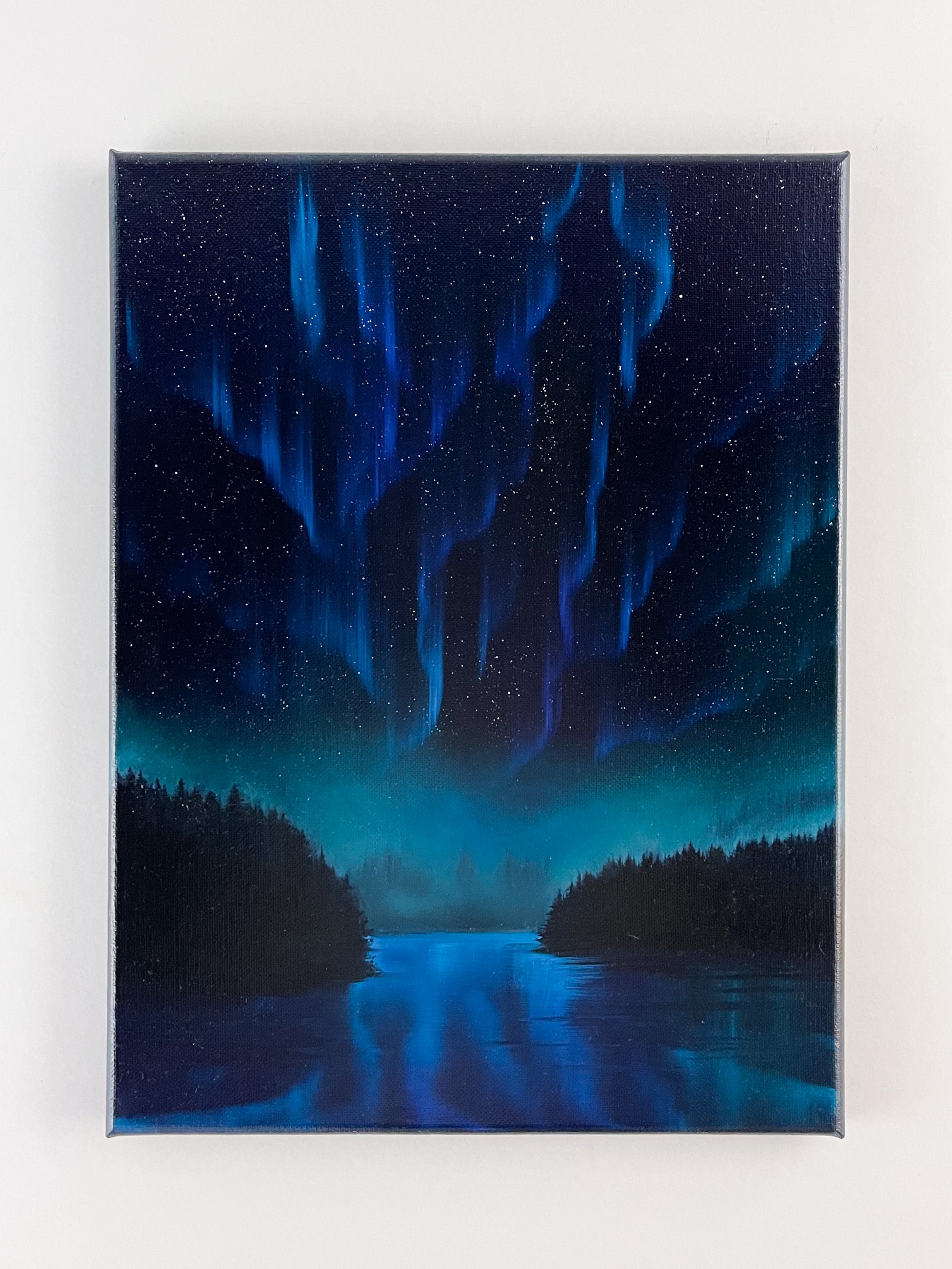Beautiful northern lights oil painting on canvas.