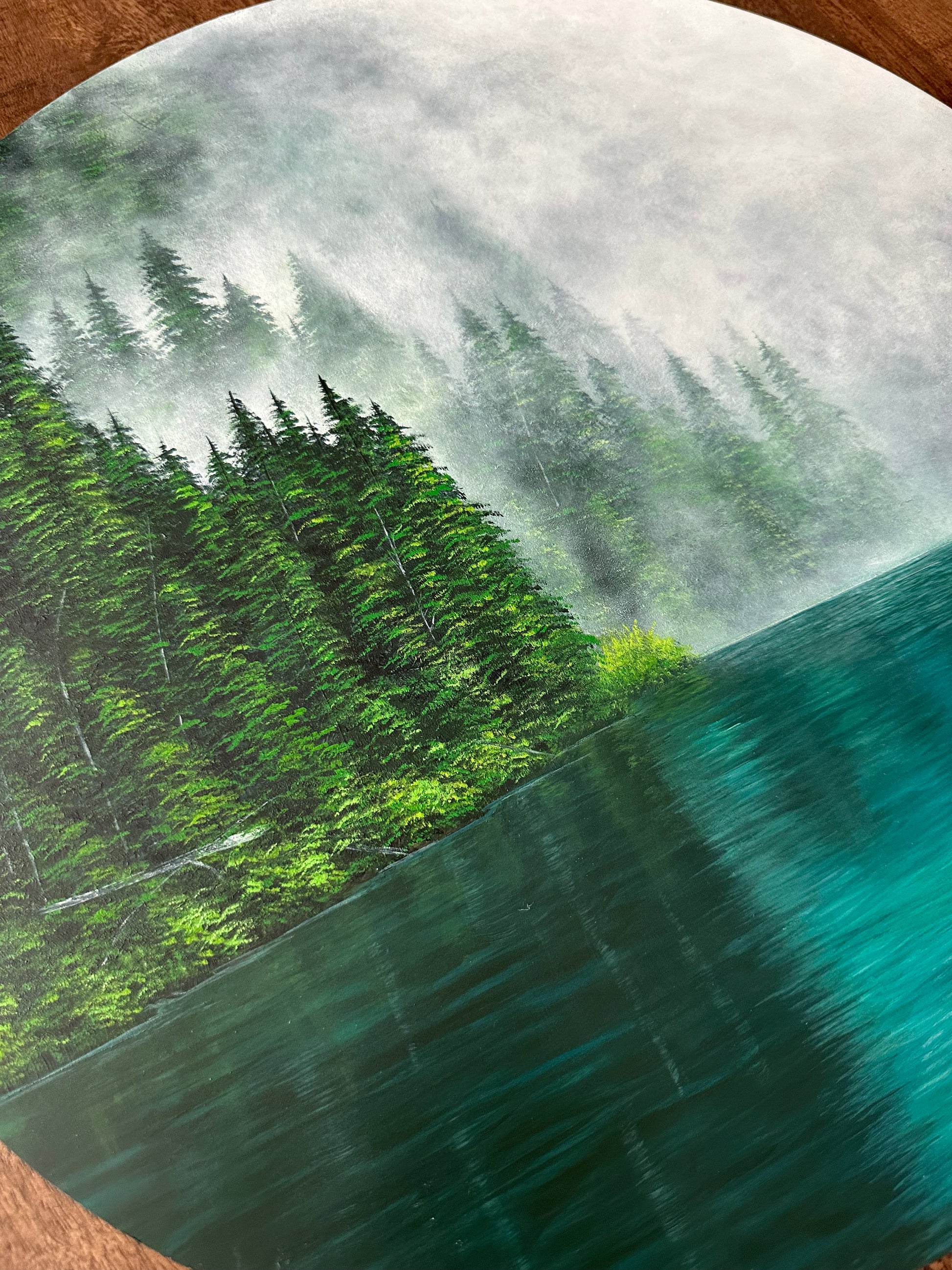 Using acrylic paints, I have carefully blended hues to capture the peaceful harmony between the misty forest and the shimmering lake. The canvas wrapped wood panel adds a touch of warmth and elegance, making it a perfect addition to any space.
