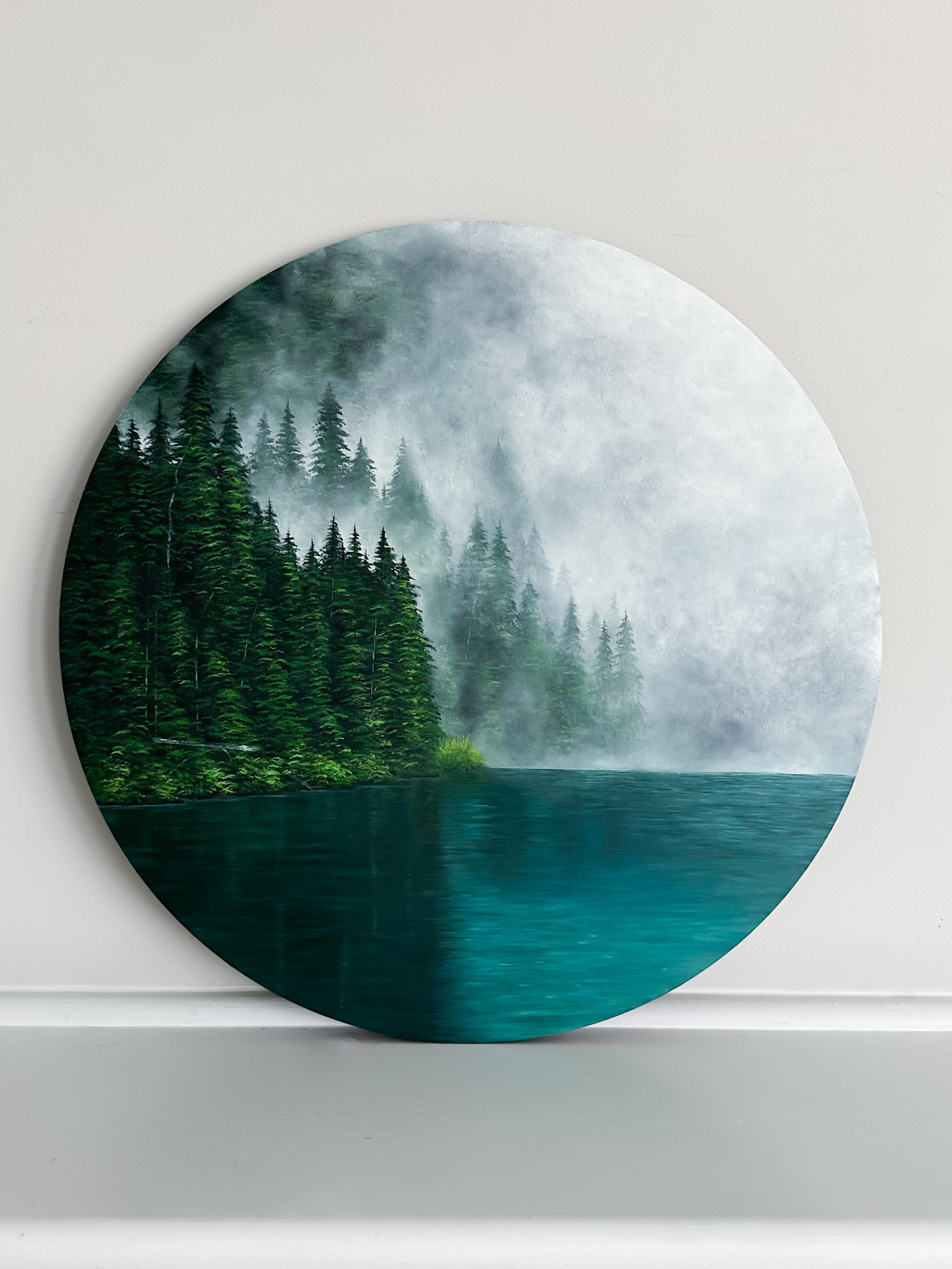 This enchanting artwork, skillfully rendered on an 18" canvas wrapped wood panel, captures the essence of a misty forest and a serene turquoise lake nestled in its embrace.