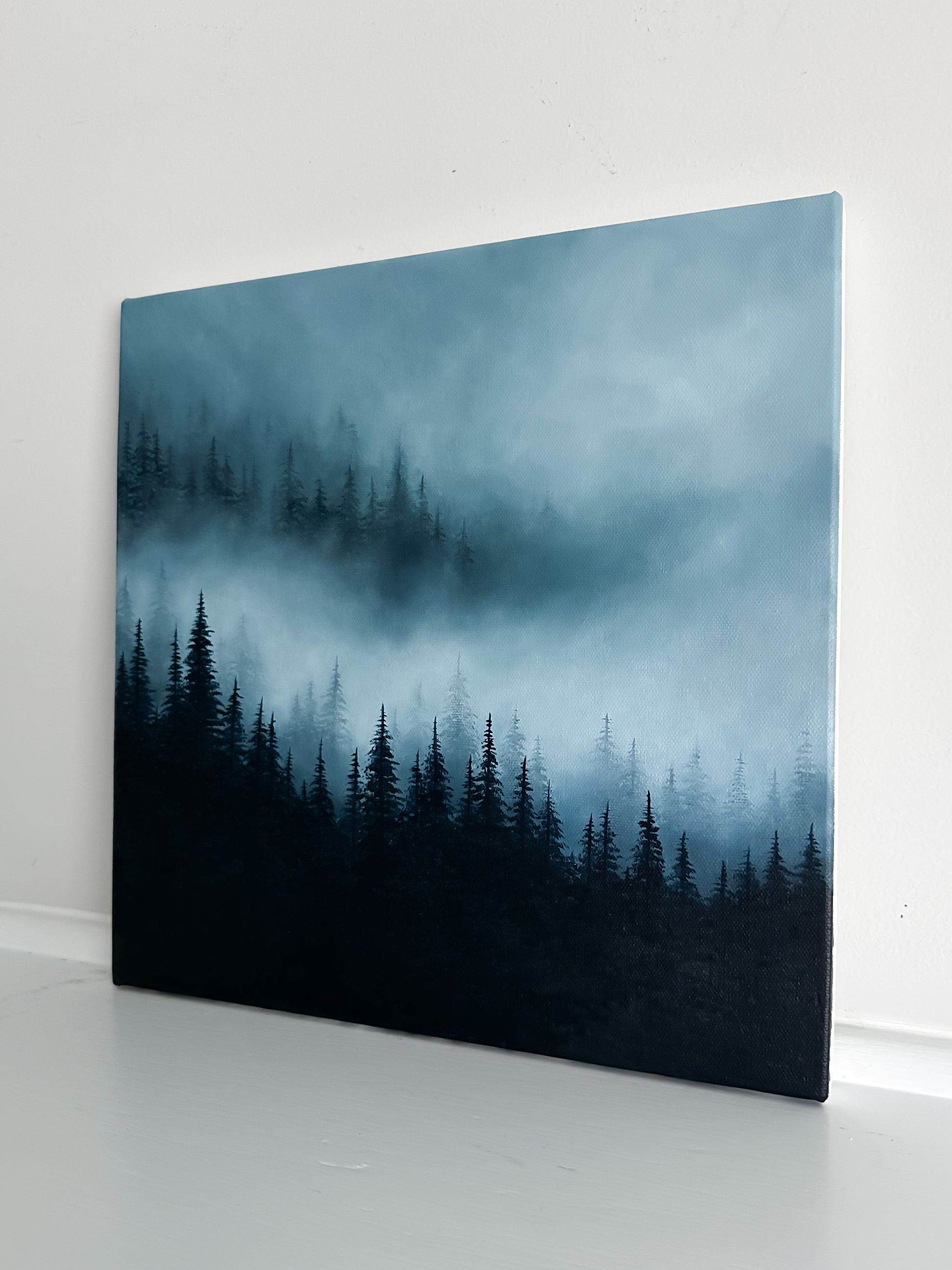 This enchanting artwork, skillfully crafted on a 12"x12" cradled canvas, transports you to a realm where a dark, mysterious forest takes center stage, shrouded in an alluring veil of secrecy.