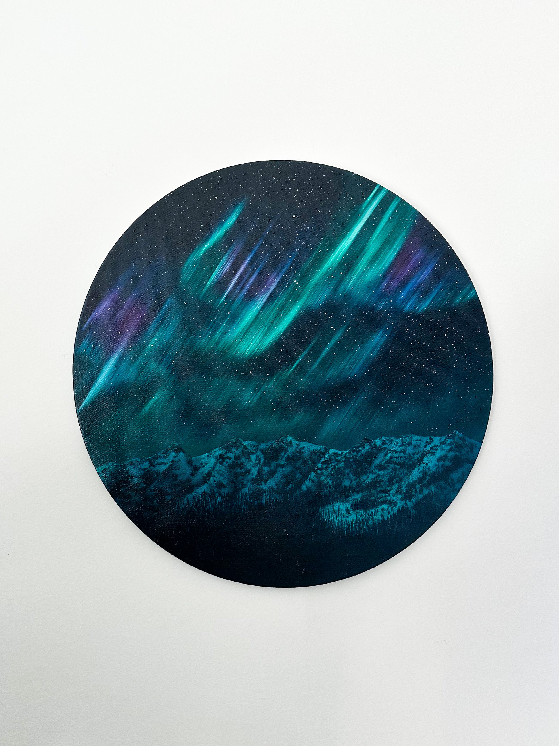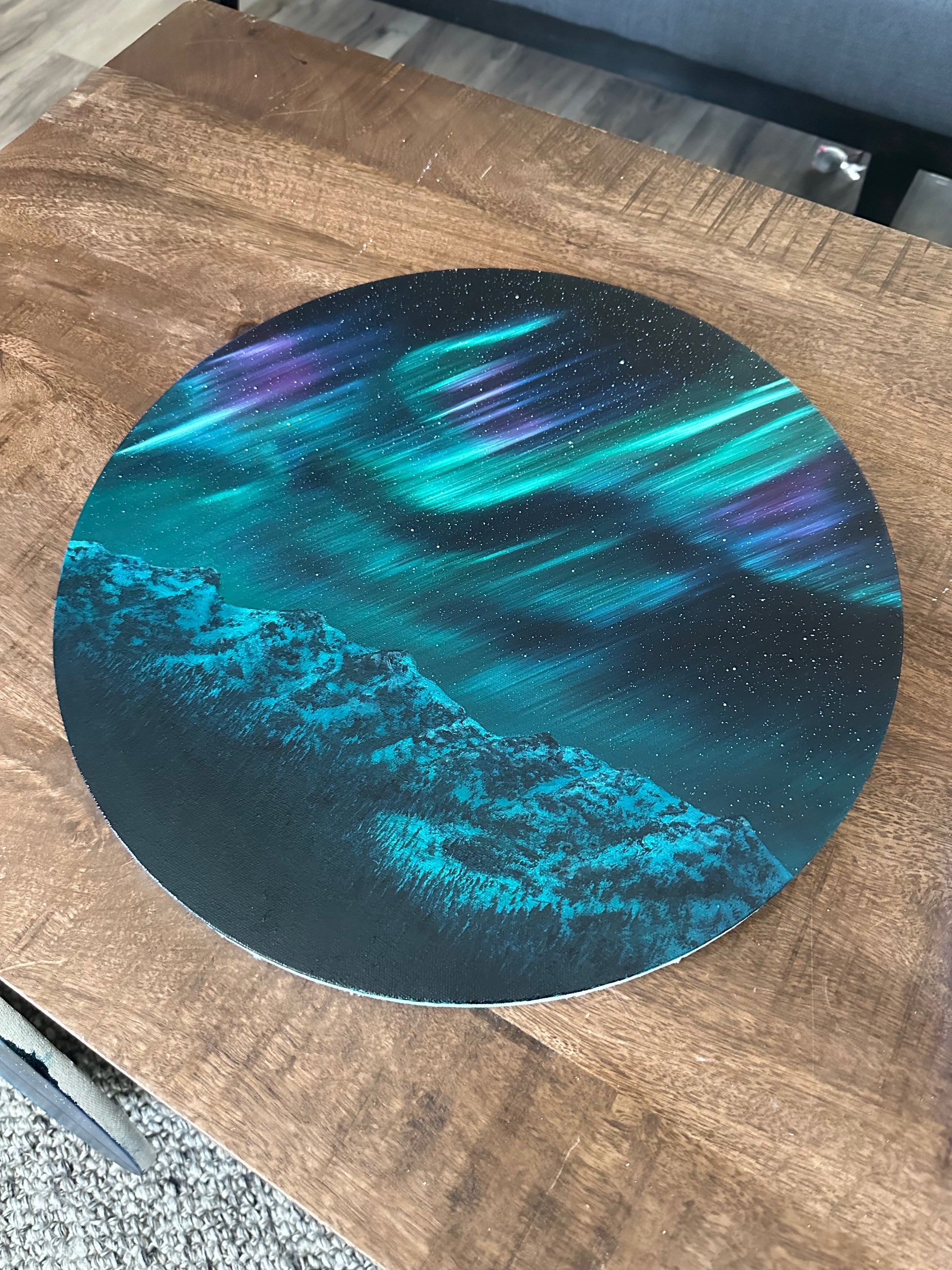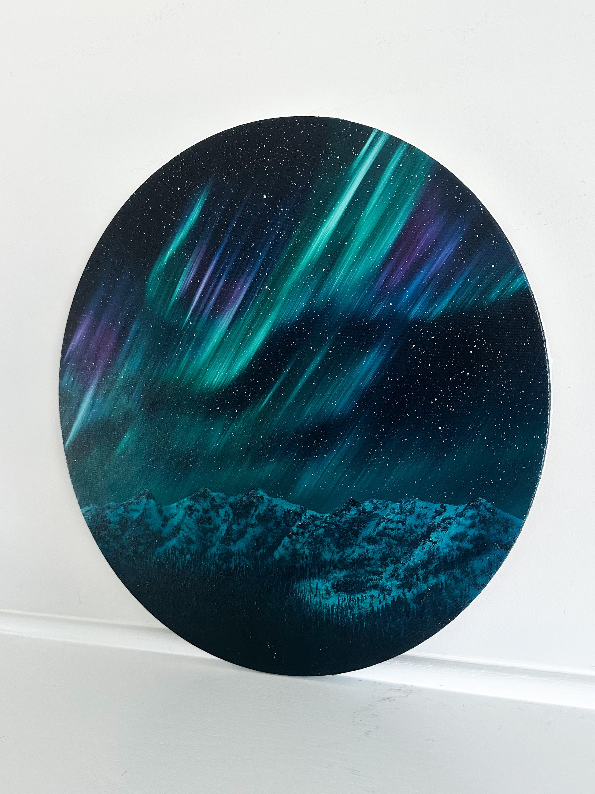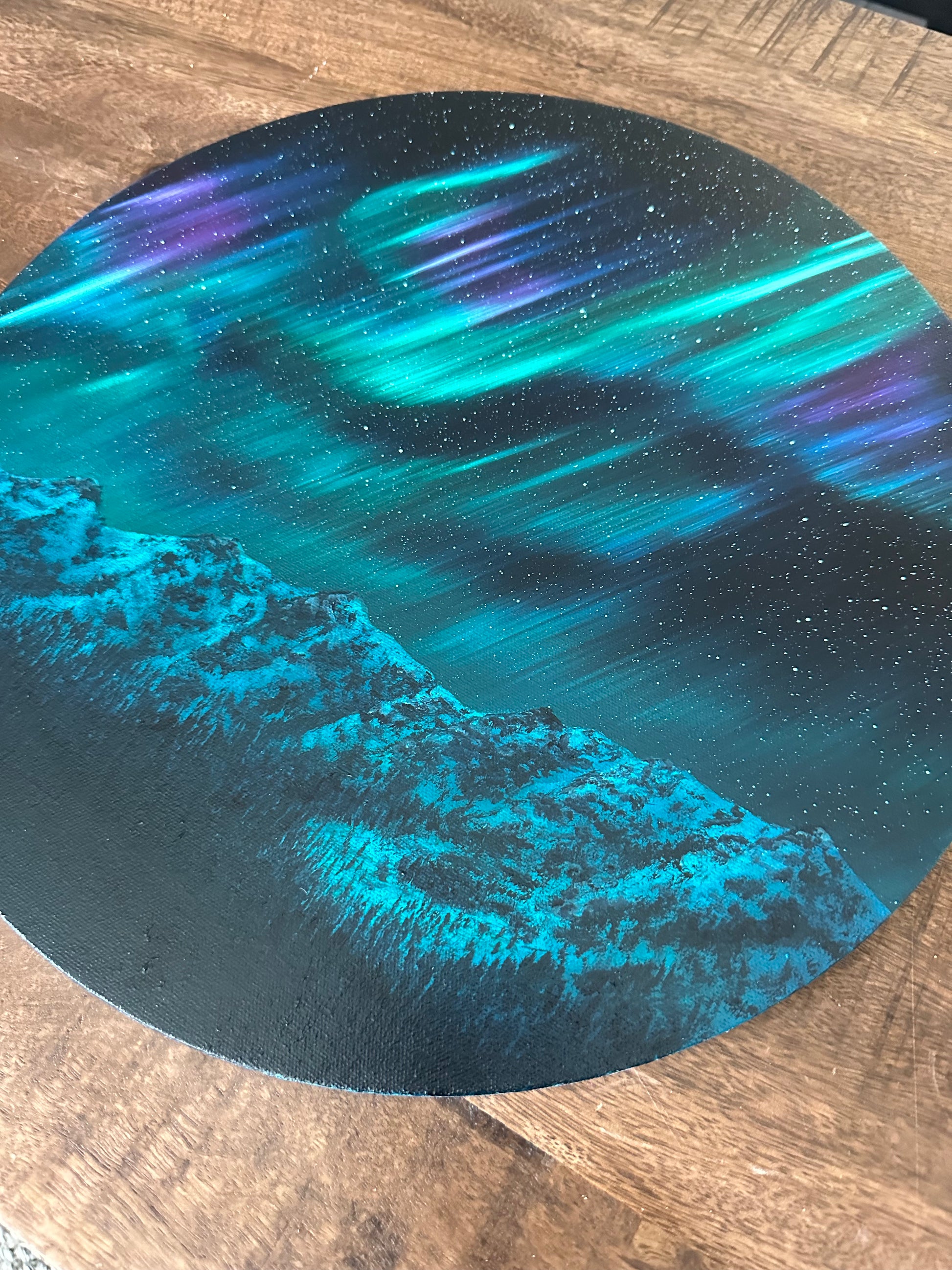 As I gaze upon this 16” round canvas, I am immediately taken aback by the breathtaking display of northern lights before me. The soft pinks, vibrant greens, and ethereal blues dance across the starry sky, illuminating the world below in a mystical glow. A snowy mountain range stretches across the horizon, providing a serene contrast to the vibrant lights above. This painting truly captures the essence of the magic that can be found in nature, and I am honored to share it with you. May it bring peace and wonder to all who behold it.