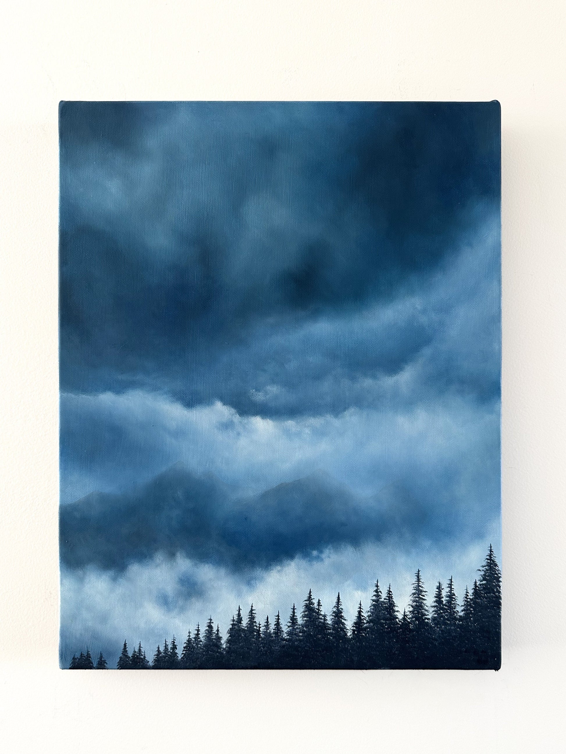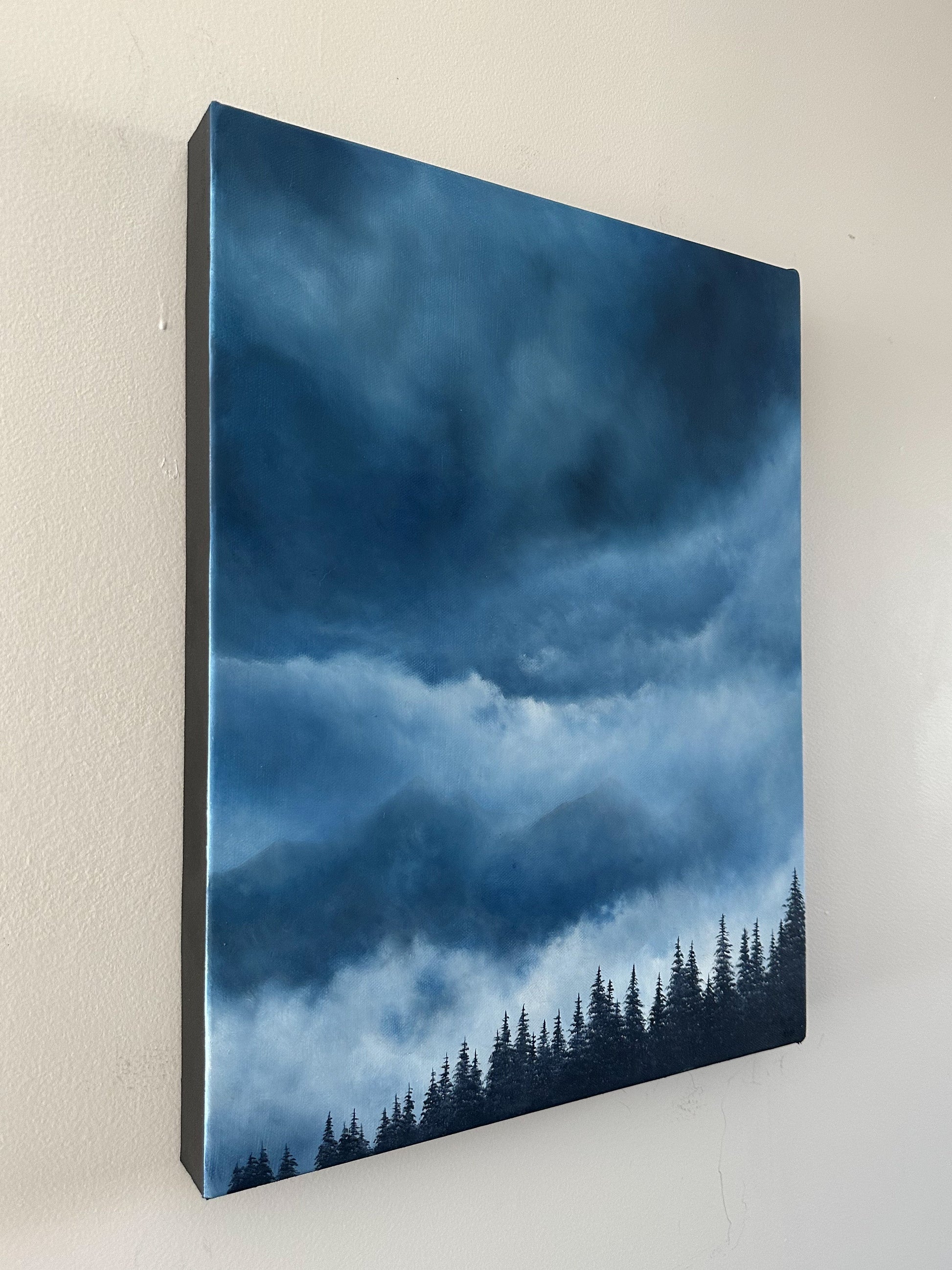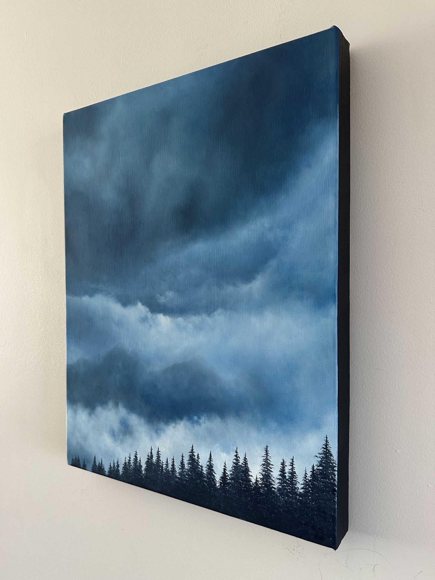 Capture the mystique of nature's drama with "Transcend" a captivating 14”x18” oil painting on cradled canvas. This striking artwork depicts a stormy, mist-laden sky almost concealing a majestic mountain ridge. The dark forest trees in the foreground add a sense of depth and balance to the composition, perfectly harmonizing the piece. Amidst the tempest, a gentle glimmer of sunlight peeks through the clouds, infusing the scene with an ethereal glow. Lose yourself in the atmospheric beauty of this mesmerizing painting, where nature's power and tranquility converge in a captivating display.