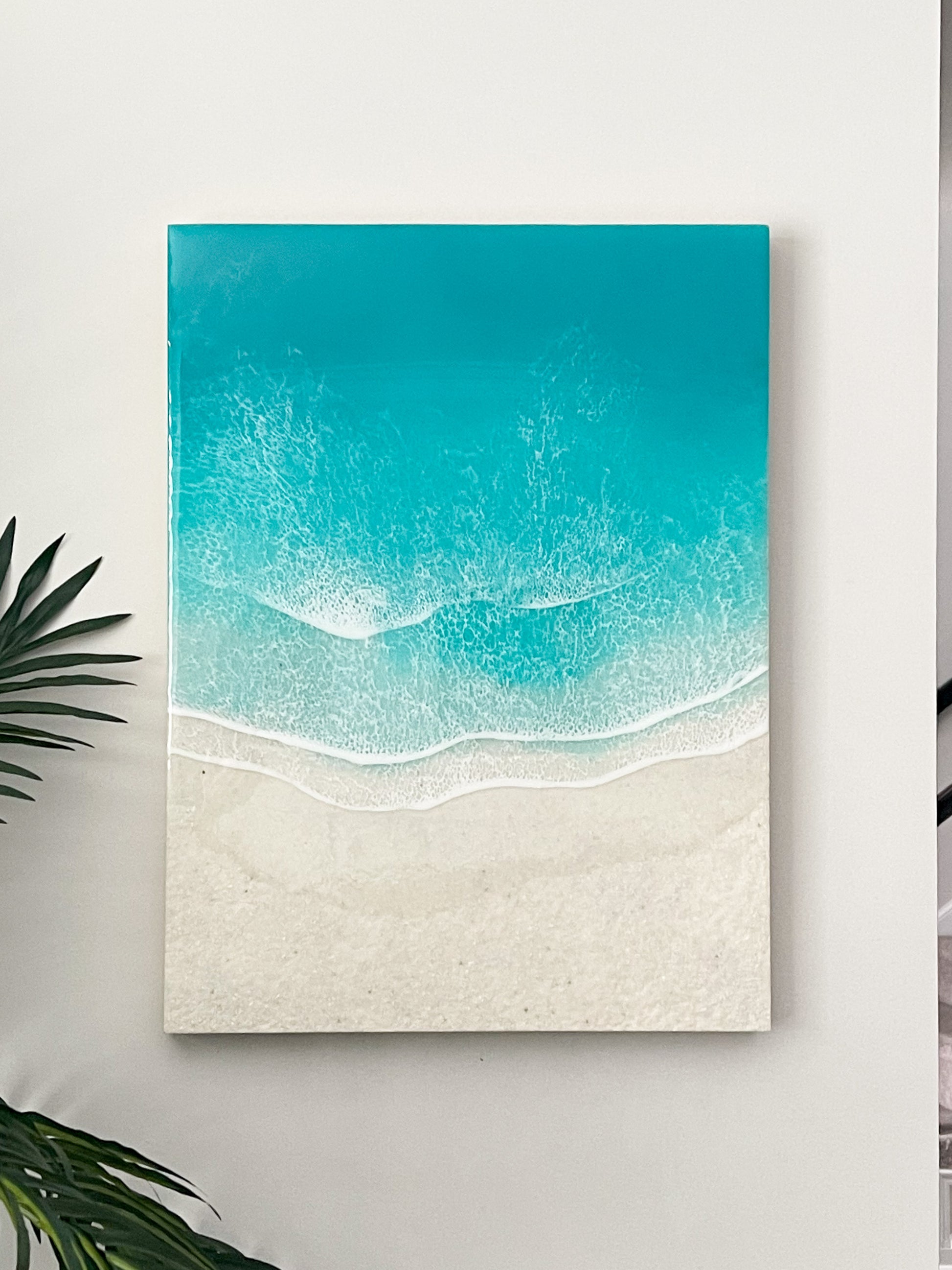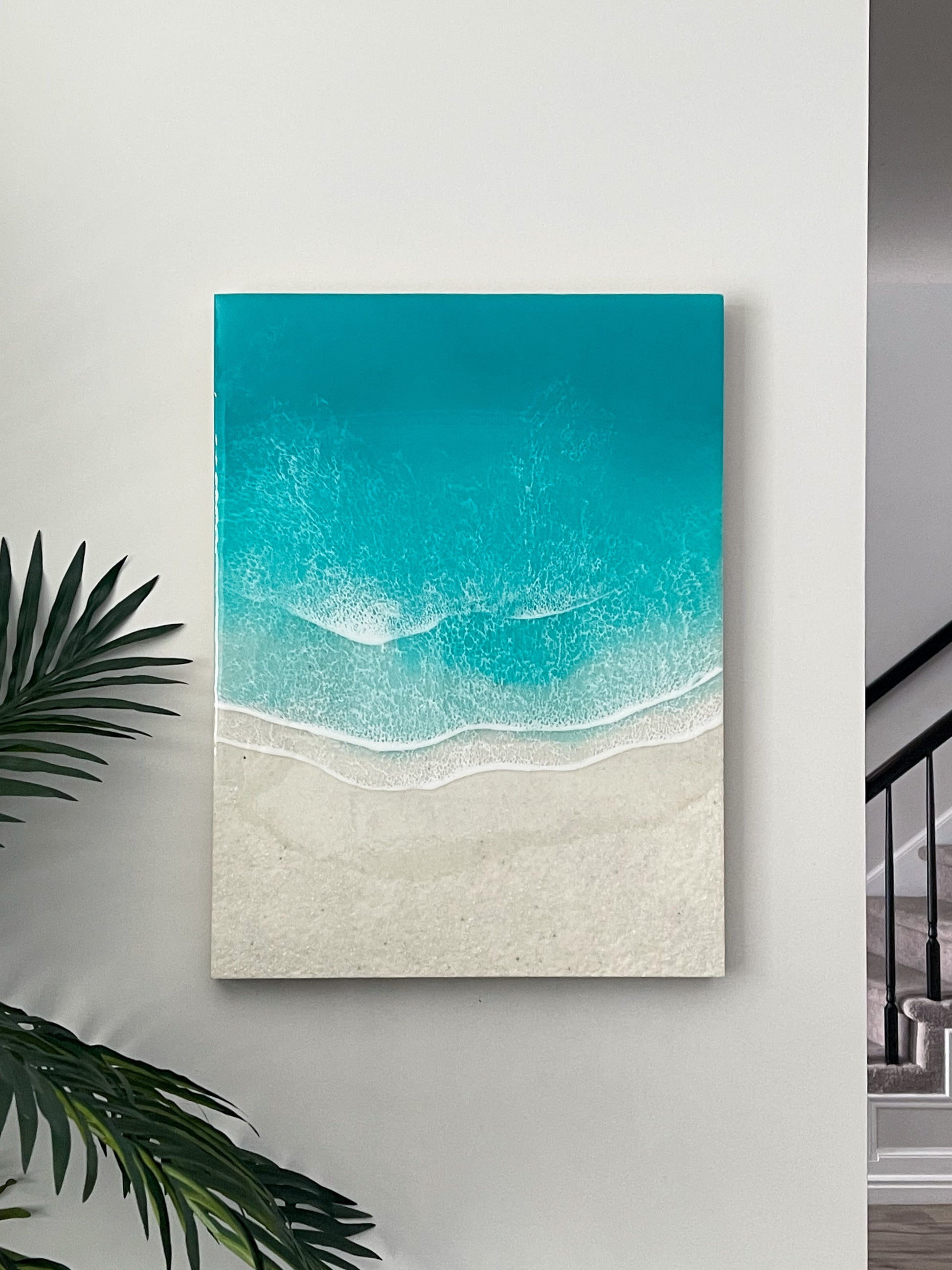 This stunning 18” x 24” x 2” resin art piece captures the beauty and serenity of the ocean in a unique and captivating way. The piece is crafted on a cradled wood panel and features real white sand from the beach, adding an authentic touch to the artwork.