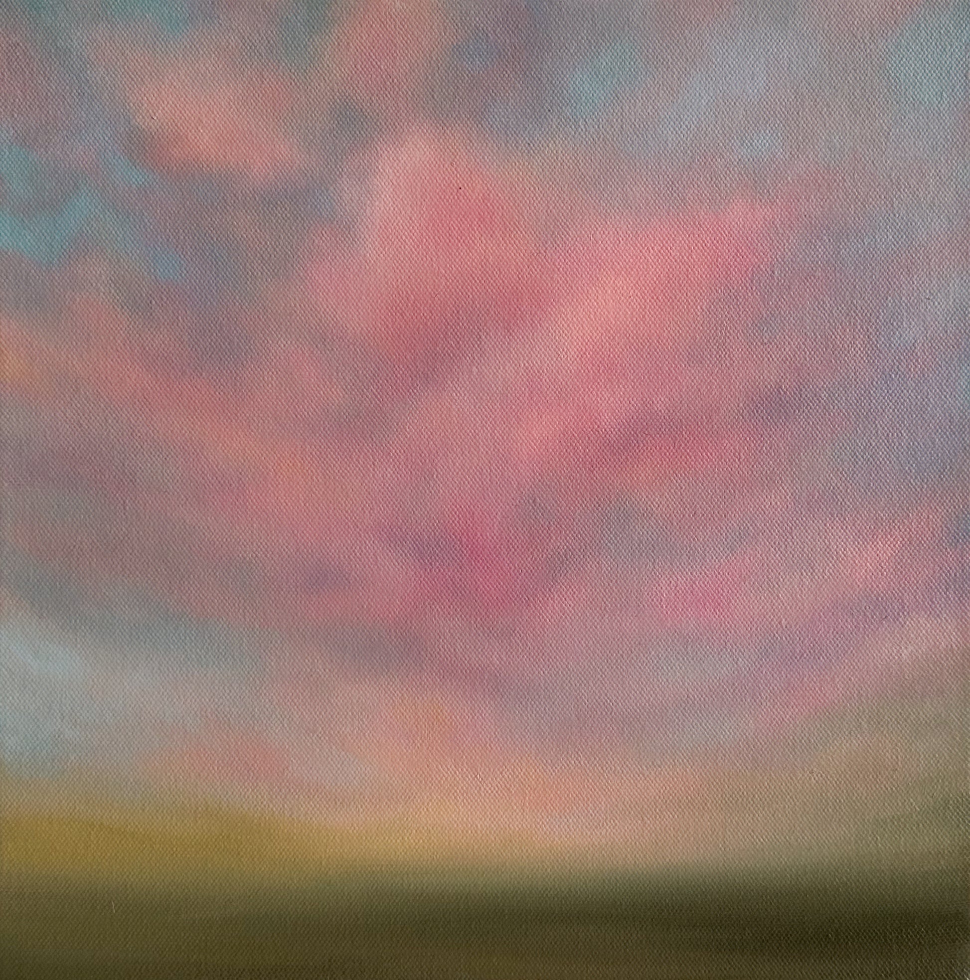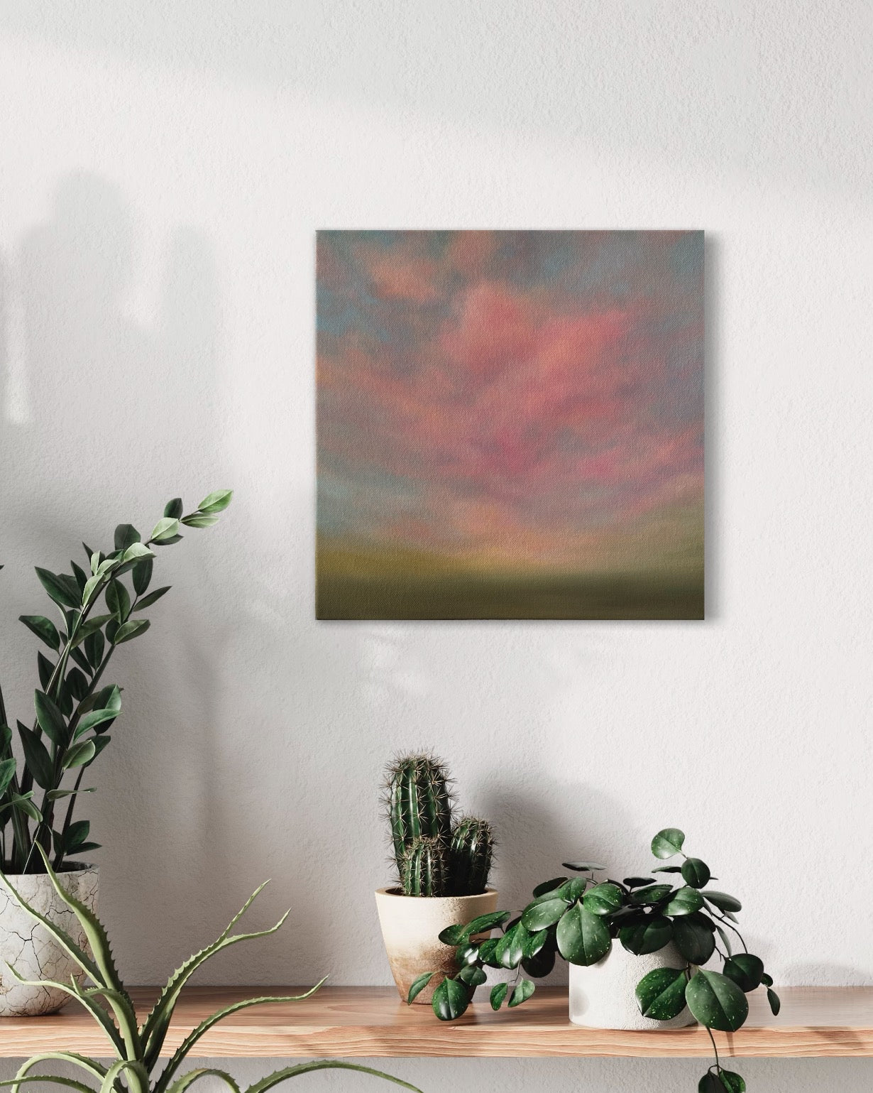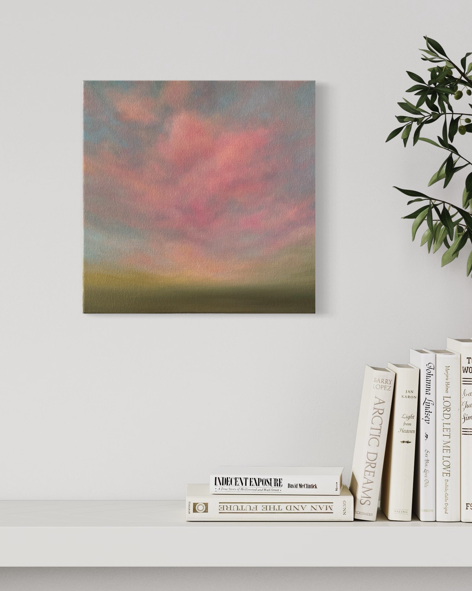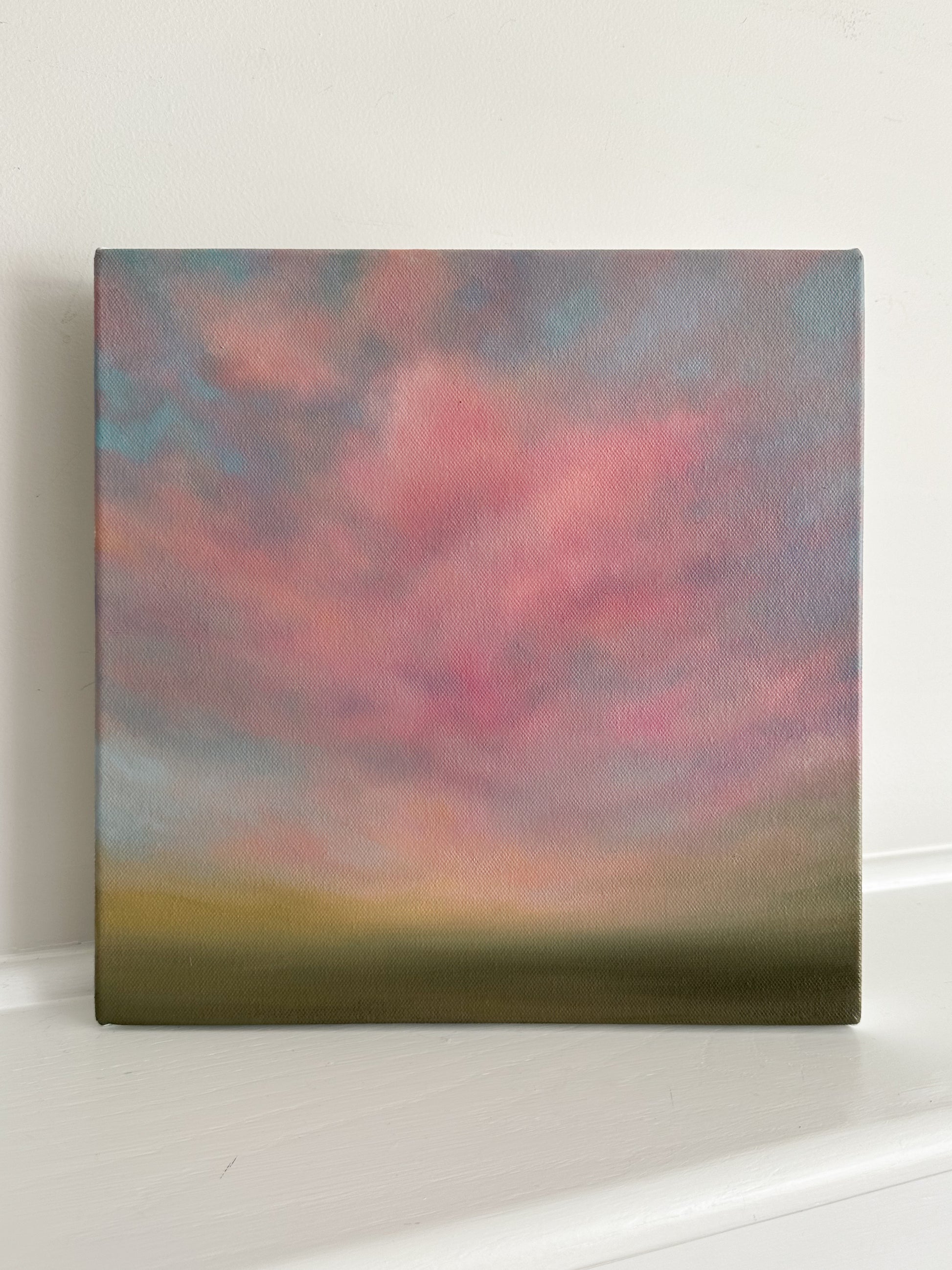 This painting depicts a vintage inspired sunset over a grassy meadow. This piece has a bit of an abstract look to it.