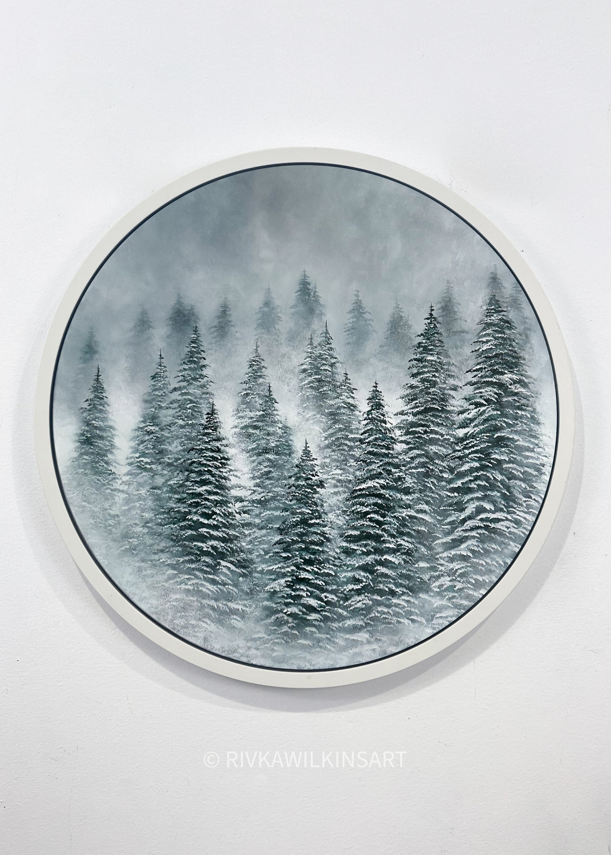 Step into the ethereal realm of winter enchantment with my acrylic painting, "Whispering Frost." This mesmerizing artwork, lovingly created on a 14" canvas wrapped wood panel, invites you to immerse yourself in a foggy forest adorned with snow-covered trees, where mist weaves its way through the wintry landscape.