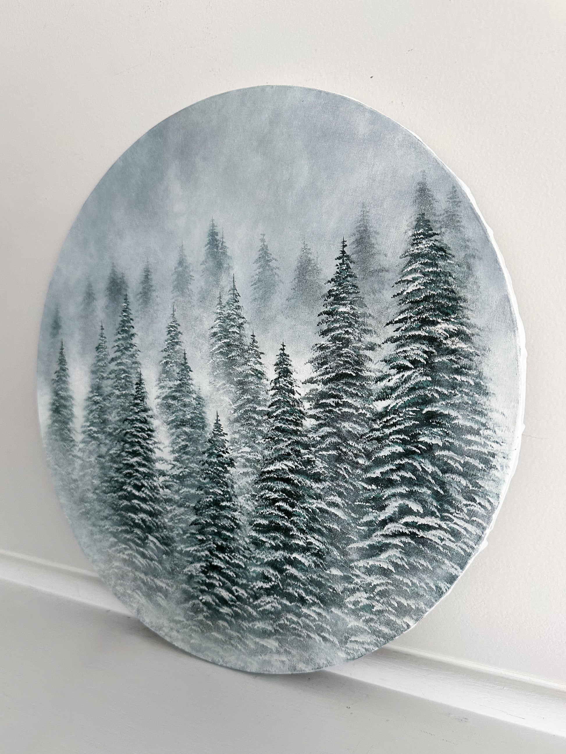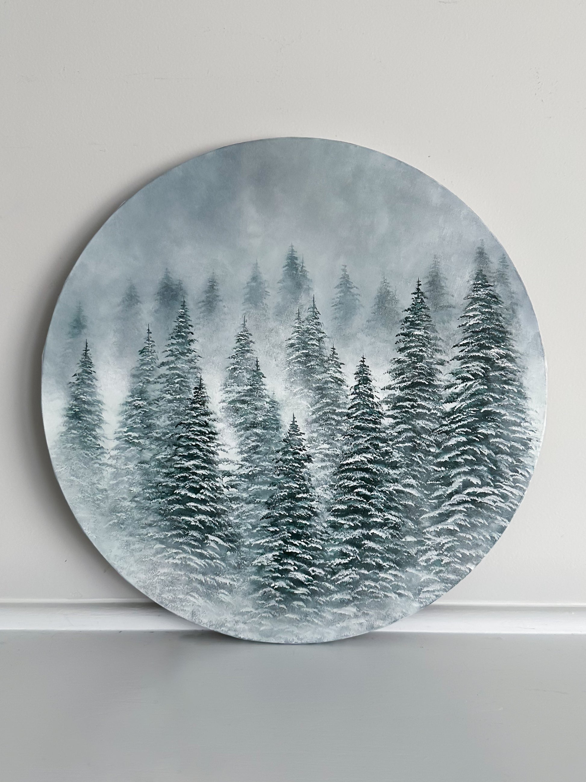 Using acrylic paints, I have skillfully captured the delicate balance between the softness of the mist, the purity of the snow, and the strength of the trees. Each brushstroke adds depth and texture, bringing the scene to life with a touch of enchantment.